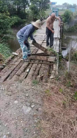 鹅湖村加油站对面的小港书院桥由于大水冲损,一直铺设木板沿用至今,下雨天过桥非常危险,导致有群众在骑车过桥时摔伤,存在安全隐患,影响附近居住的4户村民日常出行。此外,还有鹅湖村14组200多名村民需要通过该桥去对300多亩水田进行耕种,群众安全出行、耕种生产深受困扰。鹅湖村委会收到群众反映后,高度重视,多次到现场进行调研,听取群众关于修桥、建桥的意见和建议,决定将4万多元项目资金用于鹅湖村小港书院桥维修工程。