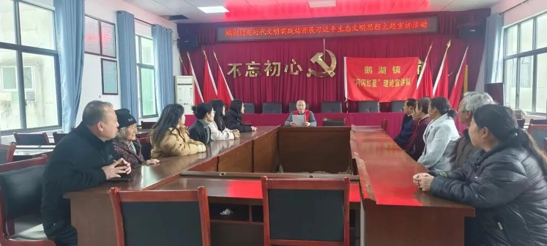 为深入学习宣传贯彻习近平新时代中国特色社会主义思想,进一步引导党员群众牢固树立和践行“绿水青山就是金山银山”理念,3月13日,鹅湖镇新时代文明实践所“闪闪红星”理论宣讲队走进鹅湖村开展习近平生态文明思想主题宣讲活动。