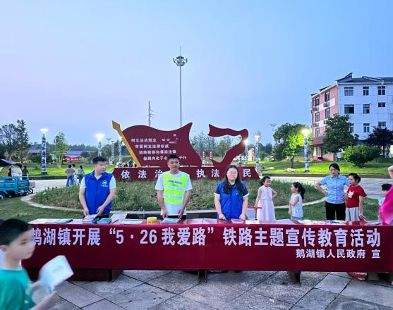 在鹅湖镇法治广场,平安法治办工作人员通过悬挂横幅、发放“知路、爱路、护路”系列宣传海报及定制宣传品,向过往村民群众普及铁路安全常识,耐心解答群众疑问,引导大家自觉遵守铁路安全规定,发现安全隐患及时报告。