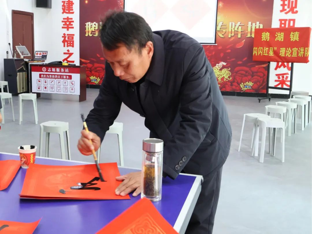 活动最后,在鹅湖镇新时代文明实践站内掀起了一股炽热的“福”潮,一场别开生面的写福、送福活动热烈开启。群众跃跃欲试,手握毛笔,在鲜艳的红纸上尽情挥毫。笔锋游走,墨香四溢,一个个或青涩稚嫩、或圆润可爱的“福”字跃然纸上,饱含着大家对新春的美好祈愿。
