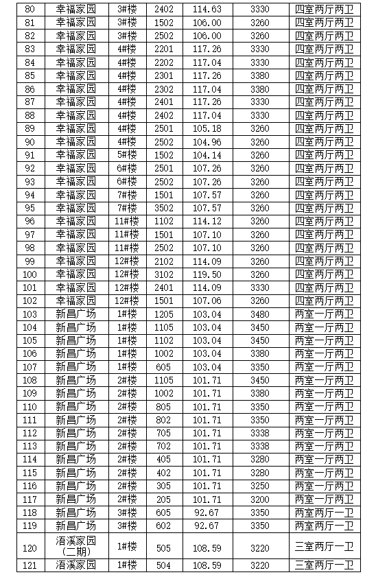建筑面积101-120平方米左右四室两厅两卫户型房源24套。(具体房源信息详见附表)