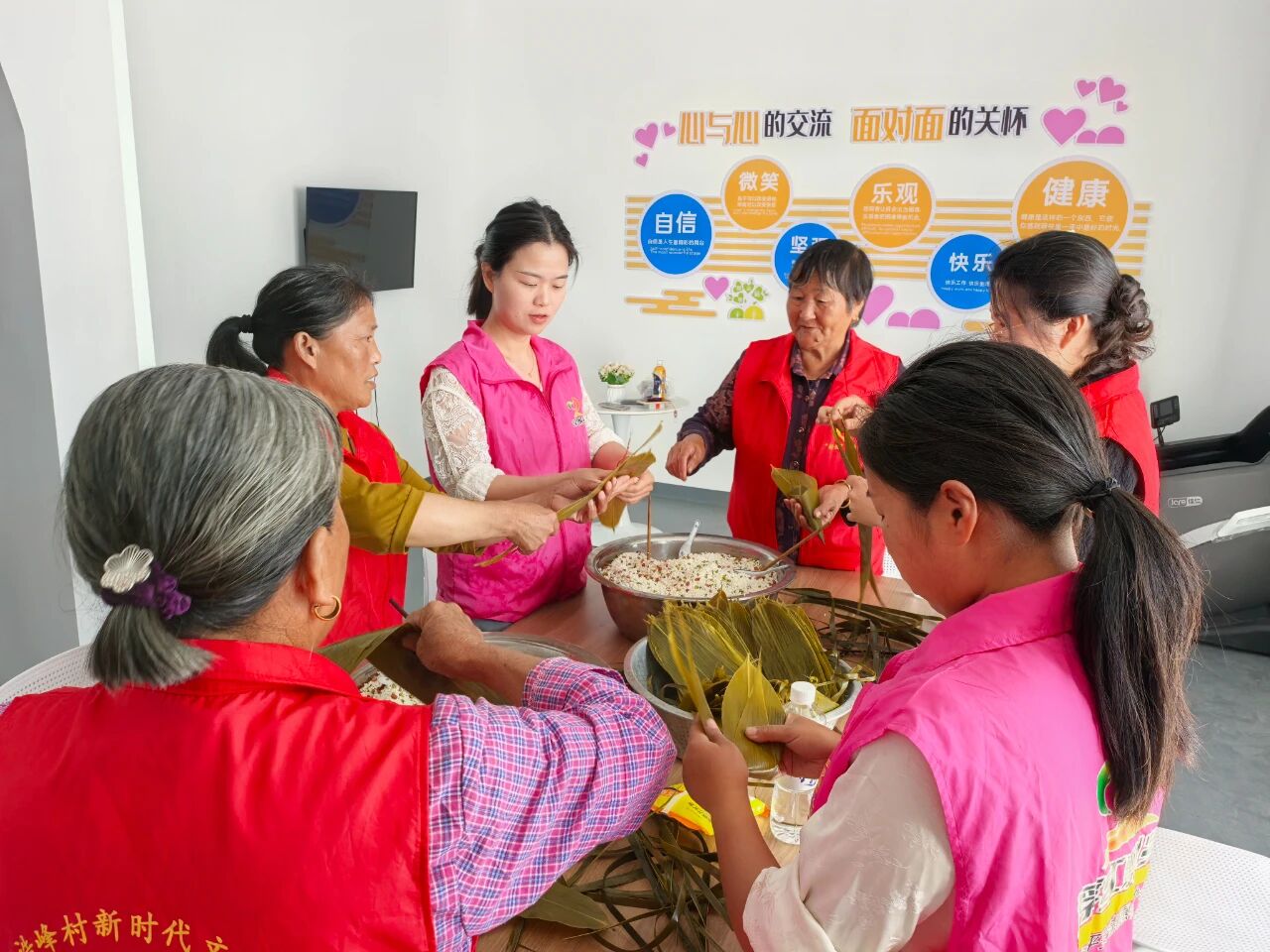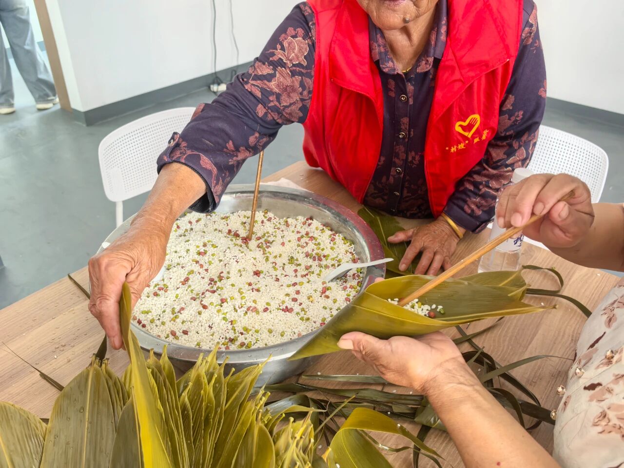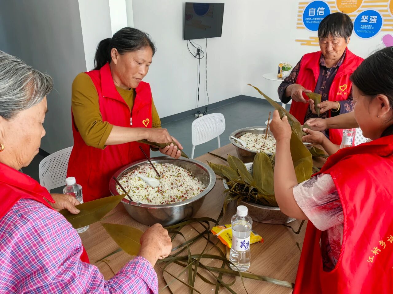 活动中,志愿者们早早地将糯米、粽叶、绿豆、红豆等包粽子的材料整齐摆放,现场弥漫着浓浓的粽香气息。活动伊始,几位经验丰富的“包粽能手”主动站出来,为大家示范包粽子的步骤:先把粽叶折成漏斗状,装上适量拌好的糯米,然后将粽叶包起来,用棕皮叶紧紧捆绑,一个饱满紧实的粽子就包好了。在她们的耐心指导下,新手们也逐渐掌握了技巧,包出的粽子有模有样。活动现场欢声笑语不断,志愿者们围在一起,一边包粽子,一边唠家常,分享着生活中的点滴趣事。大家相互学习、相互帮助,气氛十分融洽。一片片翠绿的粽叶、一粒粒晶莹的糯米,在村民们的巧手下,变成了一个个饱含祝福的粽子,也串起了邻里间浓浓的情谊 。