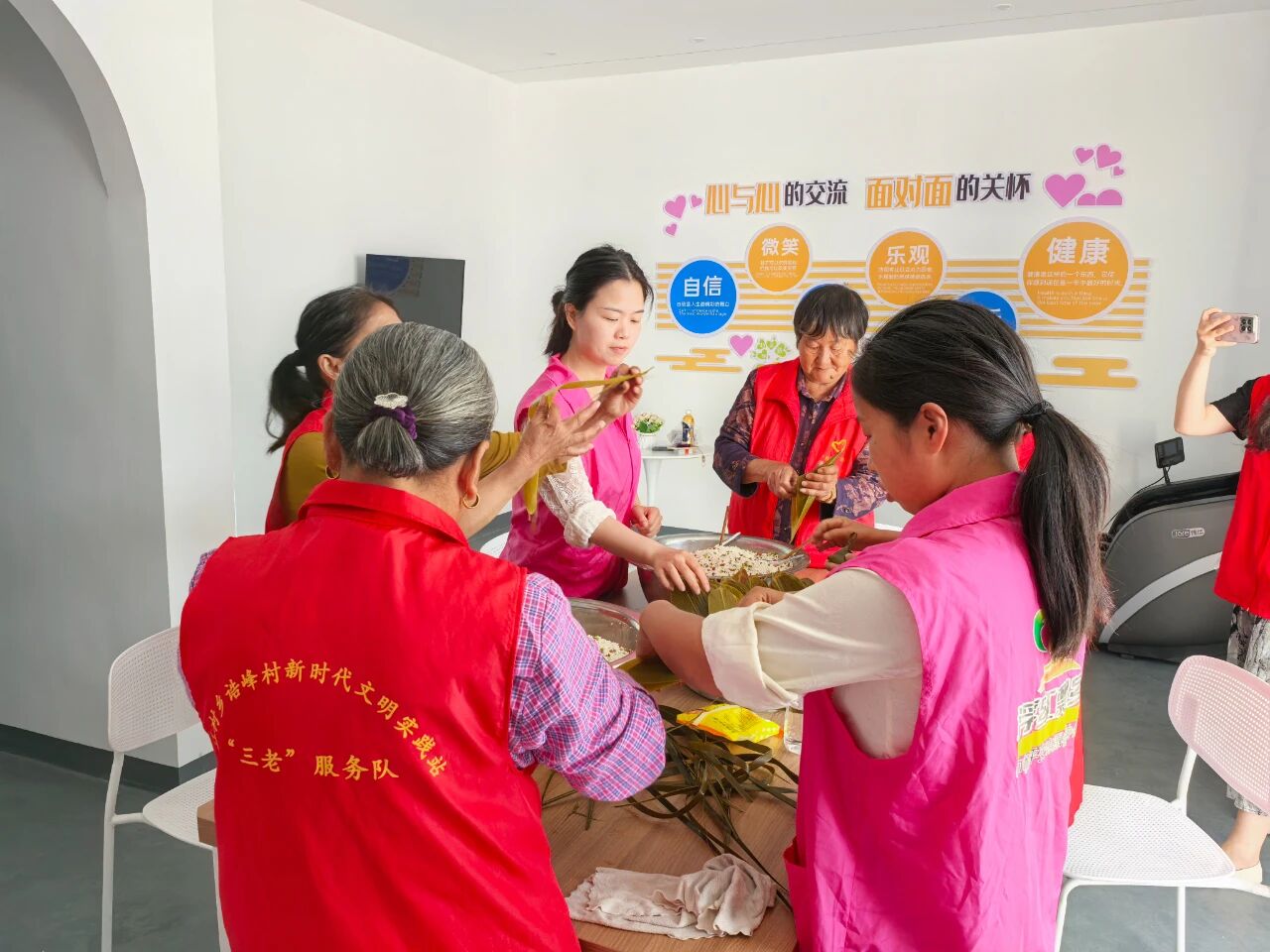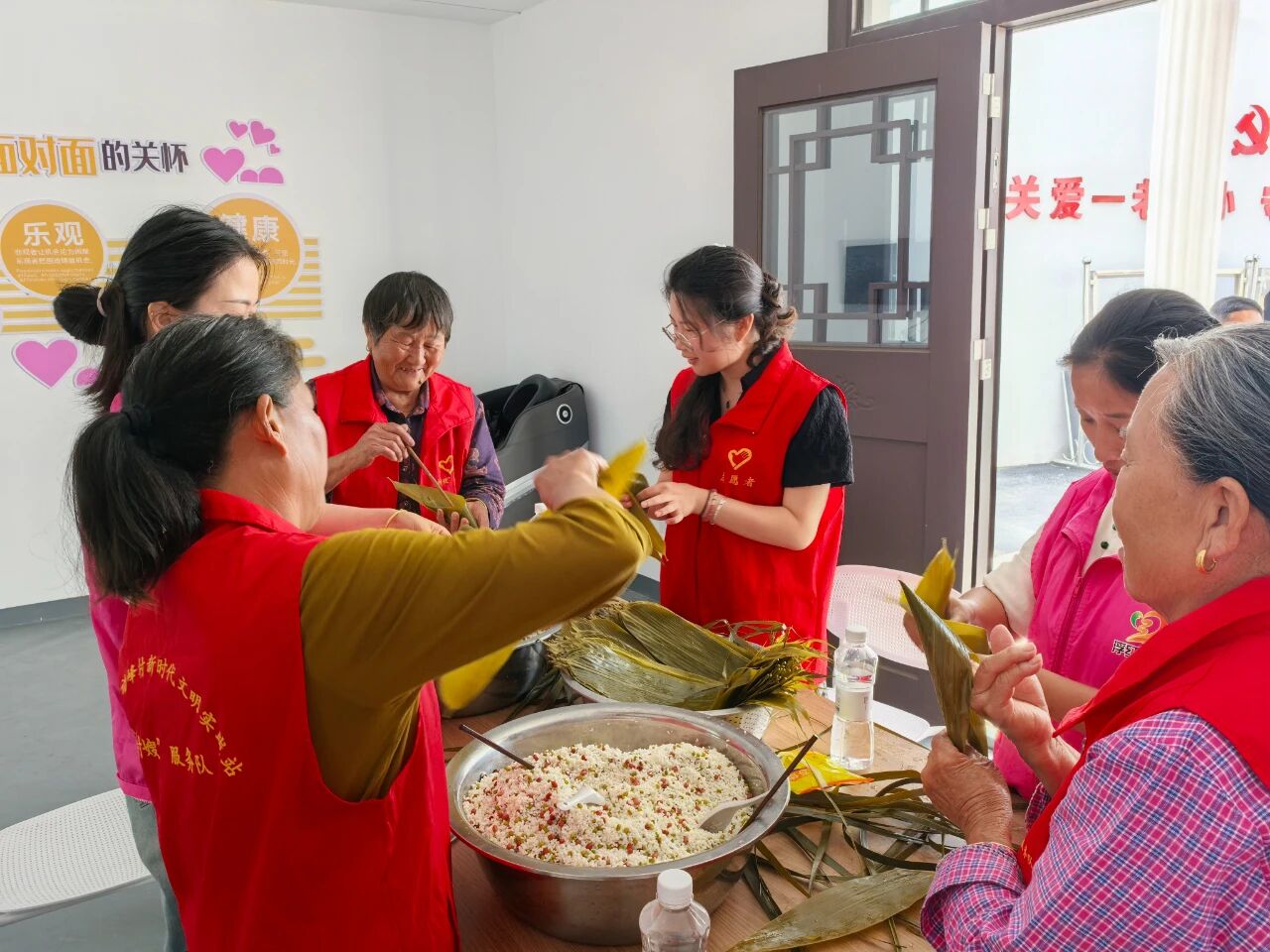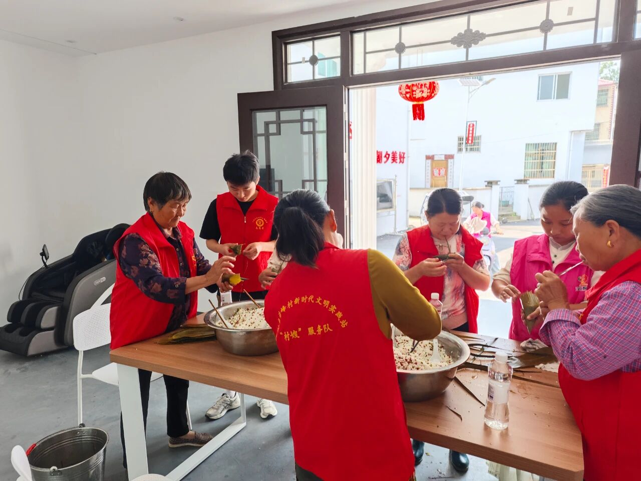 活动中,志愿者们早早地将糯米、粽叶、绿豆、红豆等包粽子的材料整齐摆放,现场弥漫着浓浓的粽香气息。活动伊始,几位经验丰富的“包粽能手”主动站出来,为大家示范包粽子的步骤:先把粽叶折成漏斗状,装上适量拌好的糯米,然后将粽叶包起来,用棕皮叶紧紧捆绑,一个饱满紧实的粽子就包好了。在她们的耐心指导下,新手们也逐渐掌握了技巧,包出的粽子有模有样。活动现场欢声笑语不断,志愿者们围在一起,一边包粽子,一边唠家常,分享着生活中的点滴趣事。大家相互学习、相互帮助,气氛十分融洽。一片片翠绿的粽叶、一粒粒晶莹的糯米,在村民们的巧手下,变成了一个个饱含祝福的粽子,也串起了邻里间浓浓的情谊 。