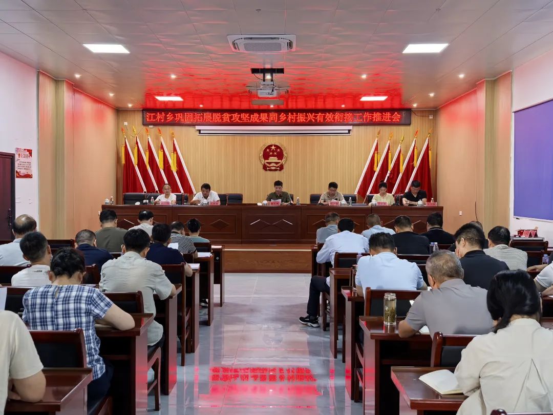 近日,江村乡召开巩固拓展脱贫攻坚成果同乡村振兴有效衔接工作推进会。乡党委副书记、乡长杨军峰出席会议并讲话,乡人大主席程子挺主持会议,乡党政班子成员、各村第一书记及村党支部书记、乡村振兴专干、学校卫生院等相关行业部门负责人以及乡机关全体干部参加会议。
