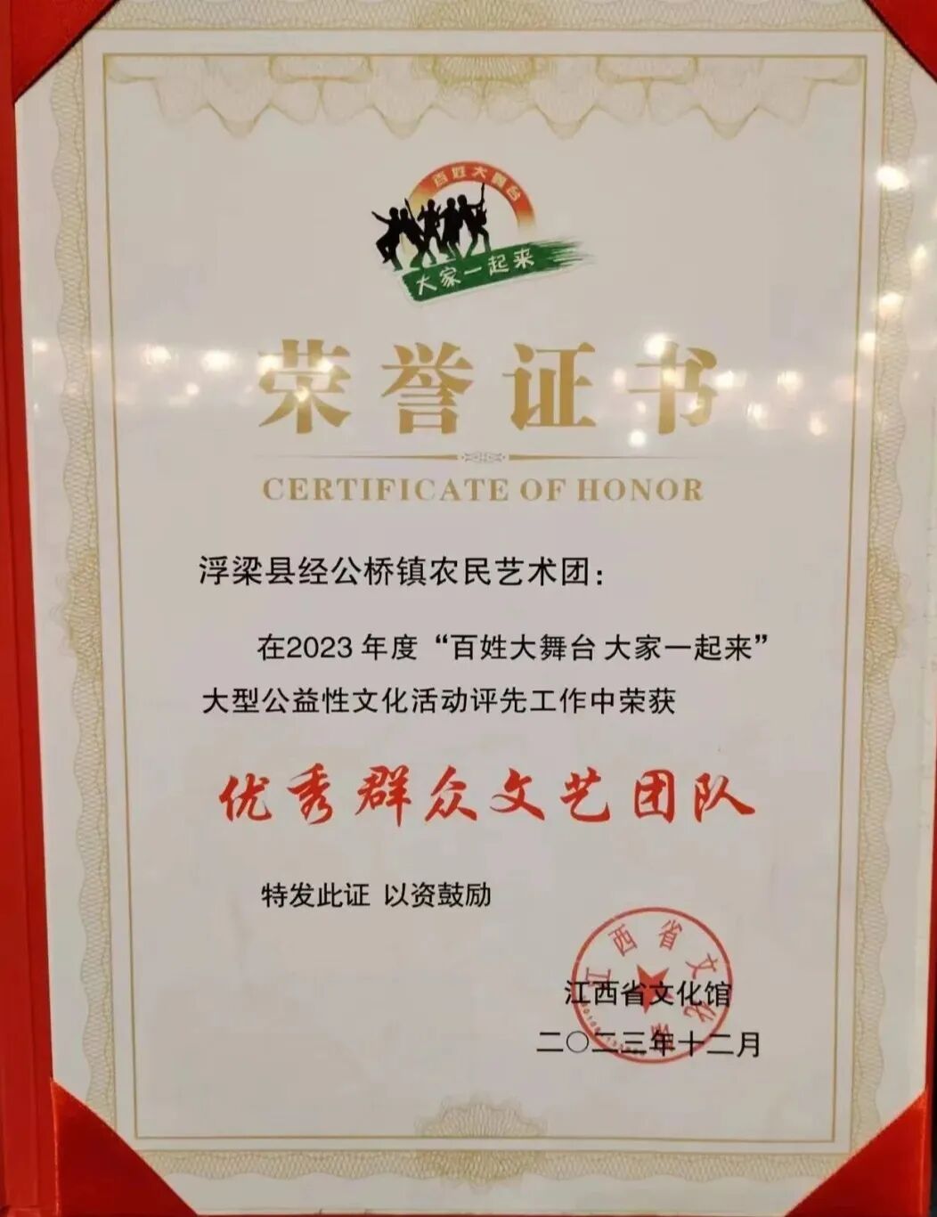“以前只在电视上看专业演出,现在咱镇上的农民艺术团一点不输给专业院团!”经公桥村村民王大姐说。2020年9月,经公桥镇农民艺术团正式成立,艺术团名下有8支队伍,分别是广场舞队、腰鼓队、军鼓队、大鼓队、连厢队、走秀队、合唱队和朗诵队,并有14支村级(含社区、教育)文艺队伍。这支由田间地头“土专家”“田秀才”组成的队伍,常年扎根乡村,把农耕生活、乡村变化、移风易俗等编进歌舞、戏曲里,2023年荣获江西省“百姓大舞台,大家一起来” 优秀群众文艺团队称号。
