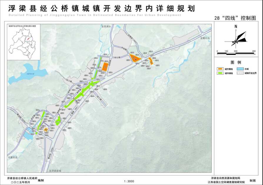 “四线”管控。根据《浮梁县经公桥镇国土空间总体规划(2021—2035年)》,共划定城市绿线2.37公顷,包括社区公园、滨水绿地等;共划定城市黄线1.23公顷,主要为供水用地、通信用地等公用设施用地;编制单元内不涉及城市蓝线和城市紫线。