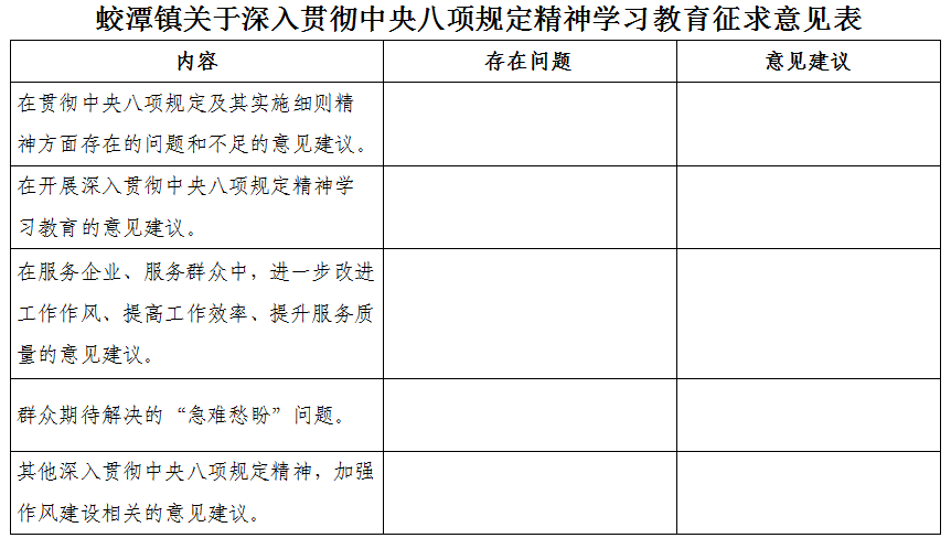 为扎实开展深入贯彻中央八项规定精神学习教育,坚持开门教育,主动接受群众监督,一体推进“学查改”融入日常、抓在经常,切实解决实际问题,现面向社会广泛征集党员、干部、群众的意见建议。