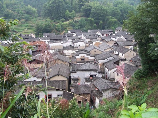 严台整个形状如同一片树叶,严台江氏宗谱中有形象的描绘:“浮梁极北隅,源尽见严溪。相其形与势,秋叶最相宜。负山更带河,四塞固村基。村藏天府内,左右密包围。天然内城堞,不待人修持。当日桃花源,风景总依稀,三面山环抱,鸟道极崎岖。一面通大道,关锁复重围。”后有武云山作靠,左侧为富春山,右侧仍为武云山,两山将村落合抱,前有笔架山为案。
