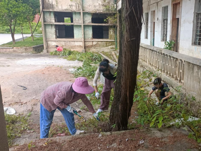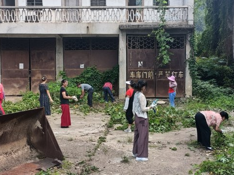 活动从社区主干道延伸到背街小巷,从绿化带边角到招待所门口,大家分工明确、默契十足。细心的阿姨们蹲在地上擦拭宣传栏和垃圾桶,擅长绿化的大姐则带着大家剪草拔草。阳光渐烈,汗水浸湿了她们的衣衫,额前的碎发黏在脸颊上,却没人喊累,有人掏出随身携带的藿香正气水分给大家,有人用草帽扇着风继续擦玻璃,欢声笑语在清扫声中此起彼伏。