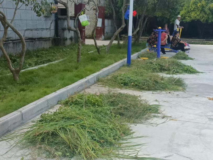 三个小时的忙碌后,社区面貌焕然一新:剪落的杂草堆成整齐的小堆,垃圾桶旁的地面都扫得干干净净。路过的居民纷纷竖起大拇指,有人拿出手机拍照发朋友圈,有人送水道谢,还有几位大爷主动加入收尾工作。