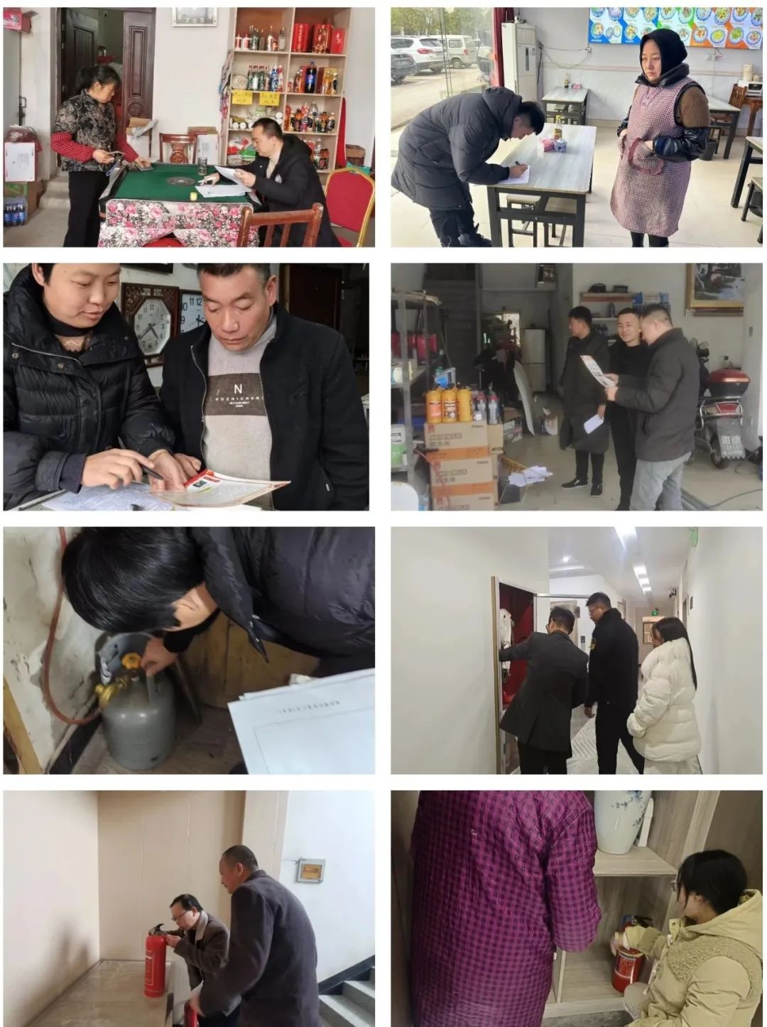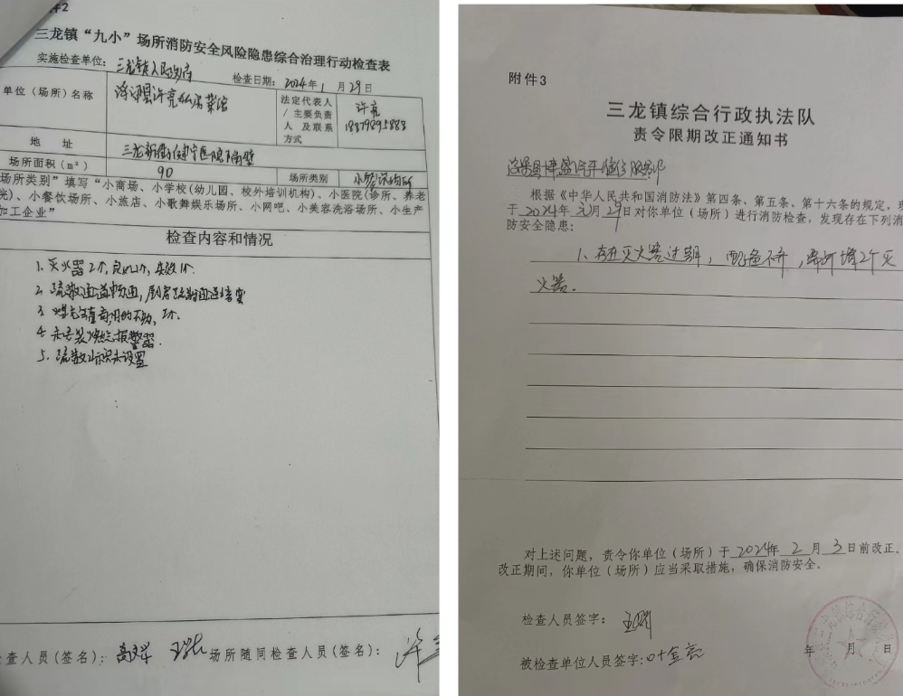 全镇干部持续开展安全生产大排查大整治行动,对用电安全、燃气安全、消防设施等安全隐患进行全面排查。对“九小”场所的检查对照整治内容一一仔细排查,并填写“三龙镇‘九小’场所消防安全风险隐患综合治理行动检查表”,对排查出的问题给被检查对象下发责令限期改正通知书,耐心和市场主体进行沟通,达成一致整改意见。