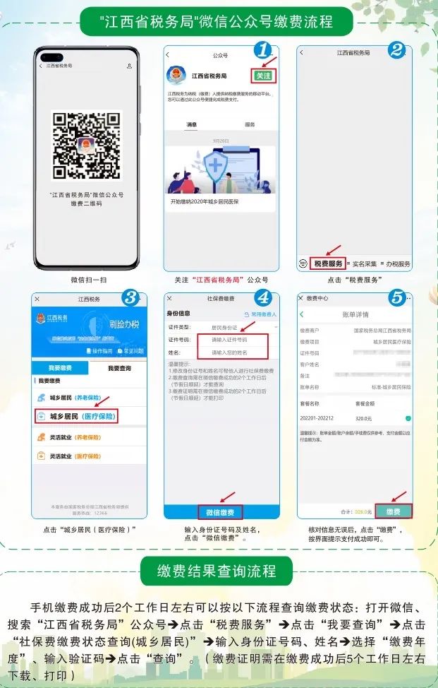 手机缴费成功后2个工作日左右可以按以下流程查询缴费状态 : 打开微信、搜索"江西省税务局"公众号→点击"税费服务"→点击“我要查询"→点击"社保费缴费状态查询(城乡居民)"→输入身份证号码、姓名→选择“缴费年度”、输入验证码→点击"查询”。(缴费证明需在缴费成功后5个工作日左右下载、打印)