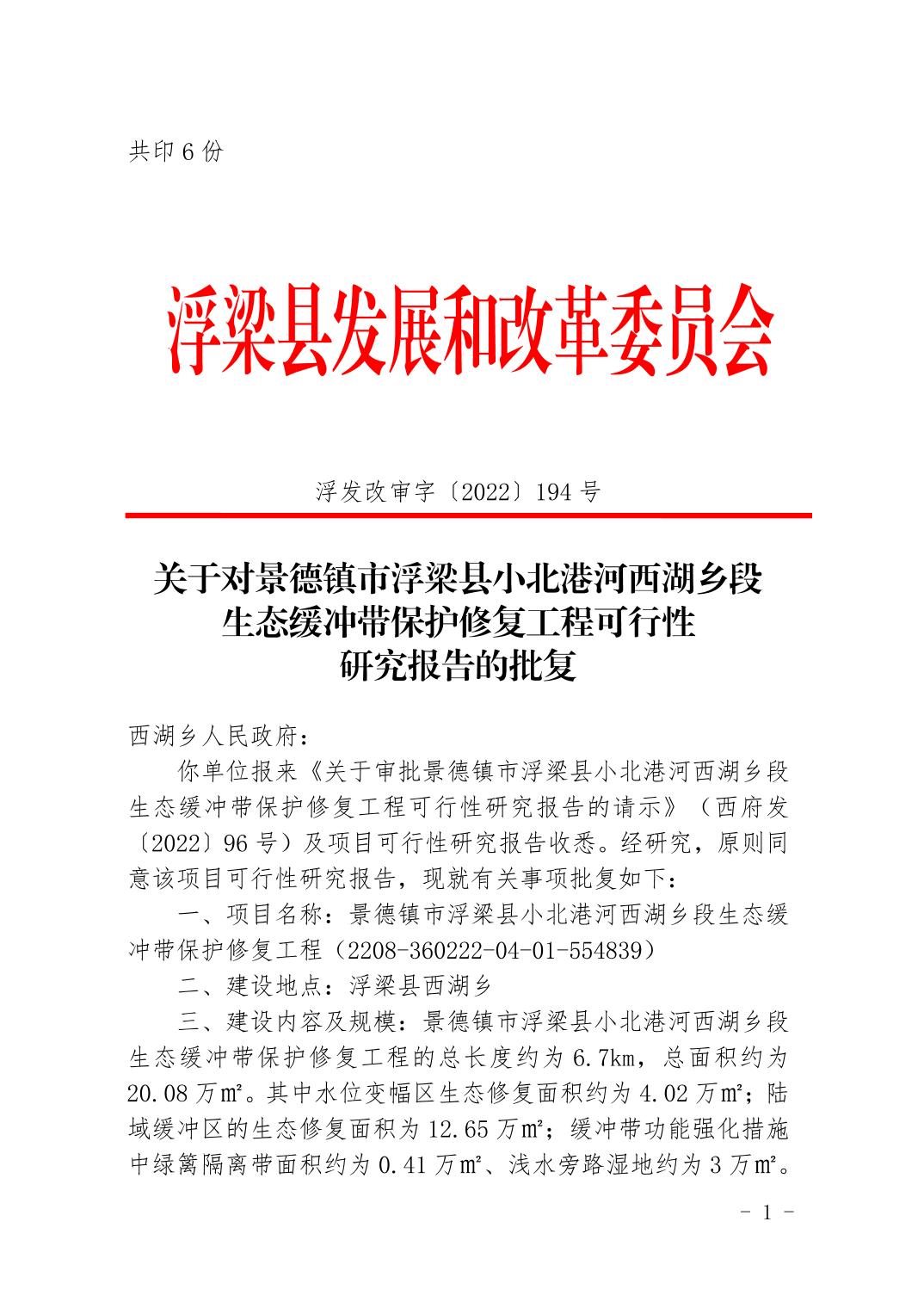 关于对景德镇市浮梁县湘湖镇人工湿地水质净化工程可行性研究报告的批复(196号)