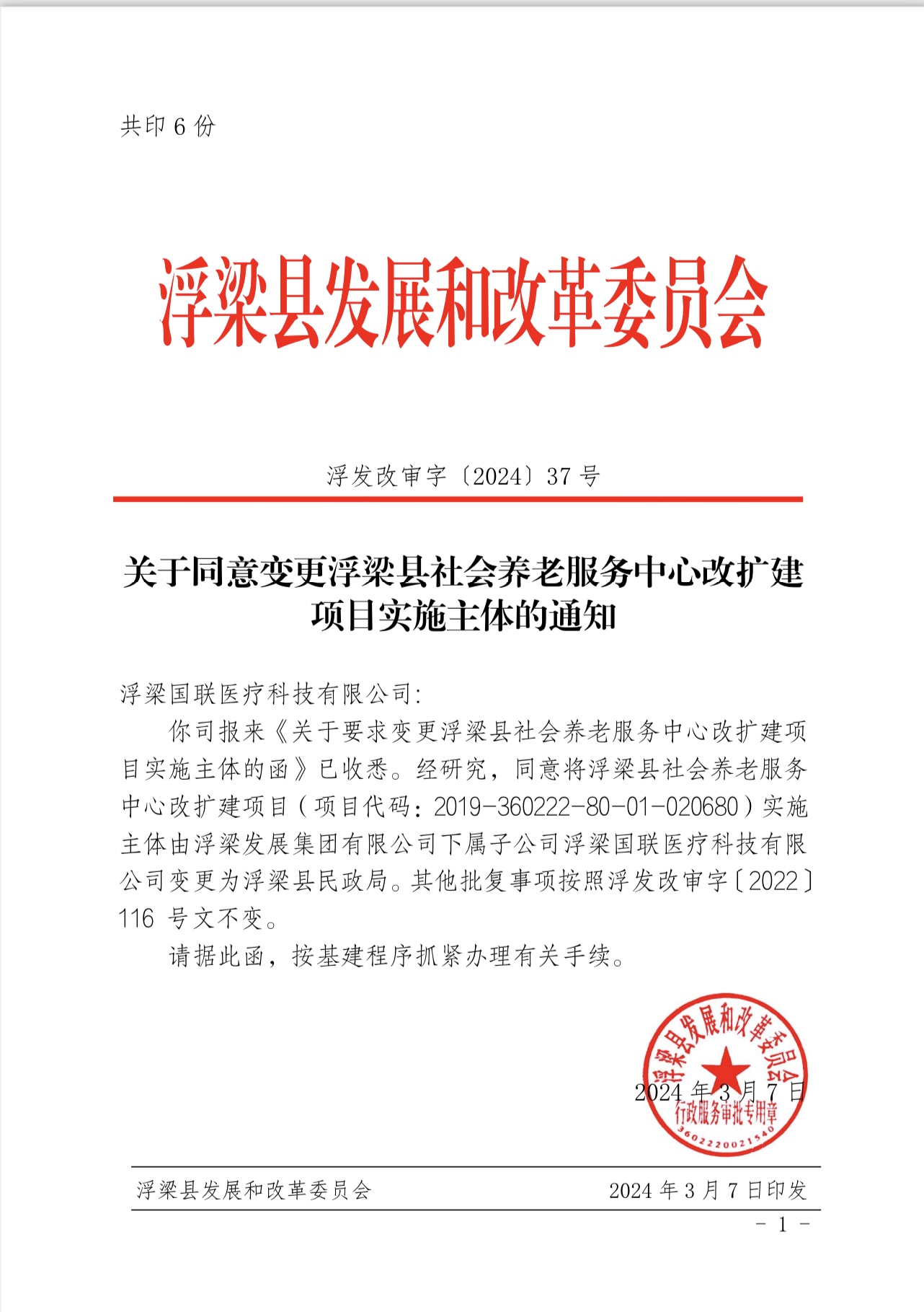 关于同意变更浮梁县社会养老服务中心改扩建项目实施主体的通知