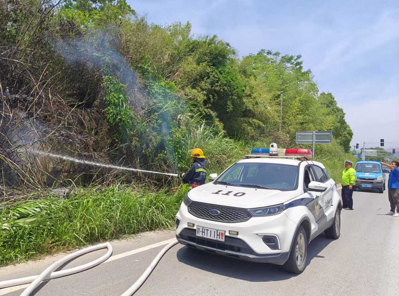 当日中午,鹅湖中队民辅警驾驶警车沿205省道开展日常巡逻,行至瑶里镇东埠村路段时,发现路边腾起滚滚浓烟。执勤人员立即停车查看,发现路边杂草、树枝正在燃烧,且火势呈蔓延趋势,起火原因暂未明确。见状,民辅警迅速联系瑶里镇专职消防队支援,并在现场维持秩序、设置警戒。很快,消防力量抵达,双方密切配合、协同作战,迅速将火势彻底扑灭。