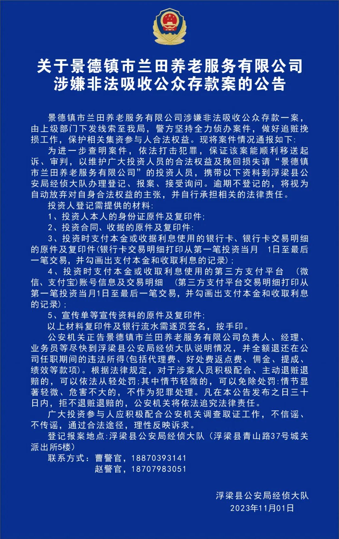 关于景德镇市兰田养老服务有限公司涉嫌非法吸收公众存款案的公告