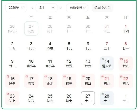 春节假期为2月15日(农历腊月二十八)至2月23日(农历正月初七),共9天,高速公路7座以下(含7座)小型客车免费通行。