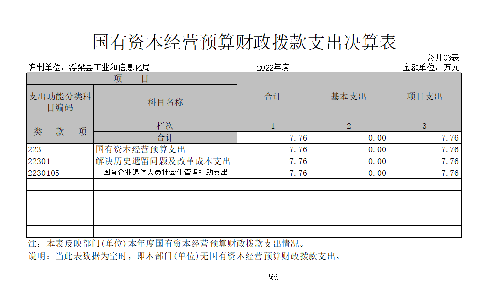 (六)国有资本经营预算支出年初预算数为 0万元,决算数为7.76万元,完成年初预算的 100 %,主要原因是:对国有企业退休人员社会化管理补助支出。