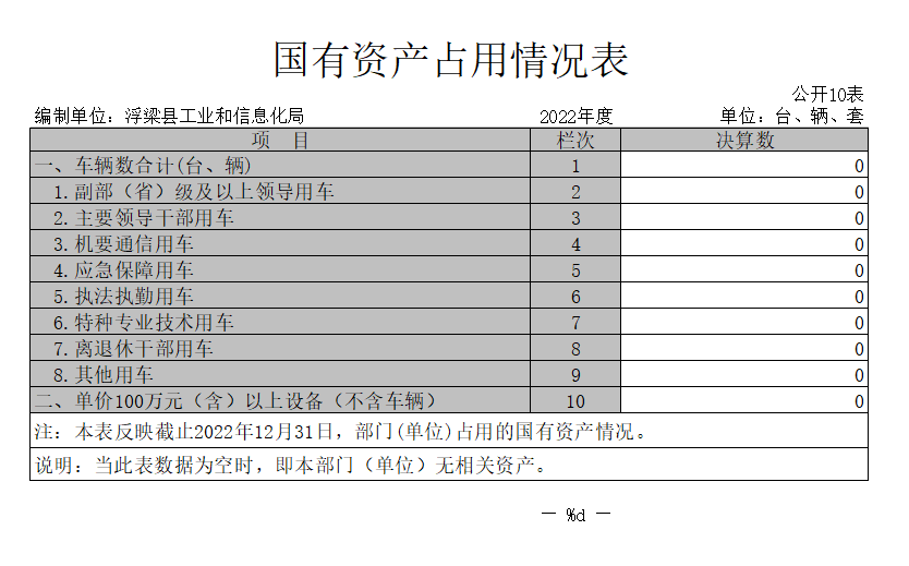 截止2022年12月31日,本单位国有资产占用情况见公开10表《国有资产占用情况表》。本单位共有车辆 0辆,其中,副部(省)级及以上领导用车 0辆、主要领导干部用车 0辆、机要通信用车 0辆、应急保障用车 0辆、执法执勤用车 0辆、特种专业技术用车 0辆、其他用车 0辆;单位价值50万元以上通用设备 0台(套);单位价值100万元以上专用设备 0台(套)。
