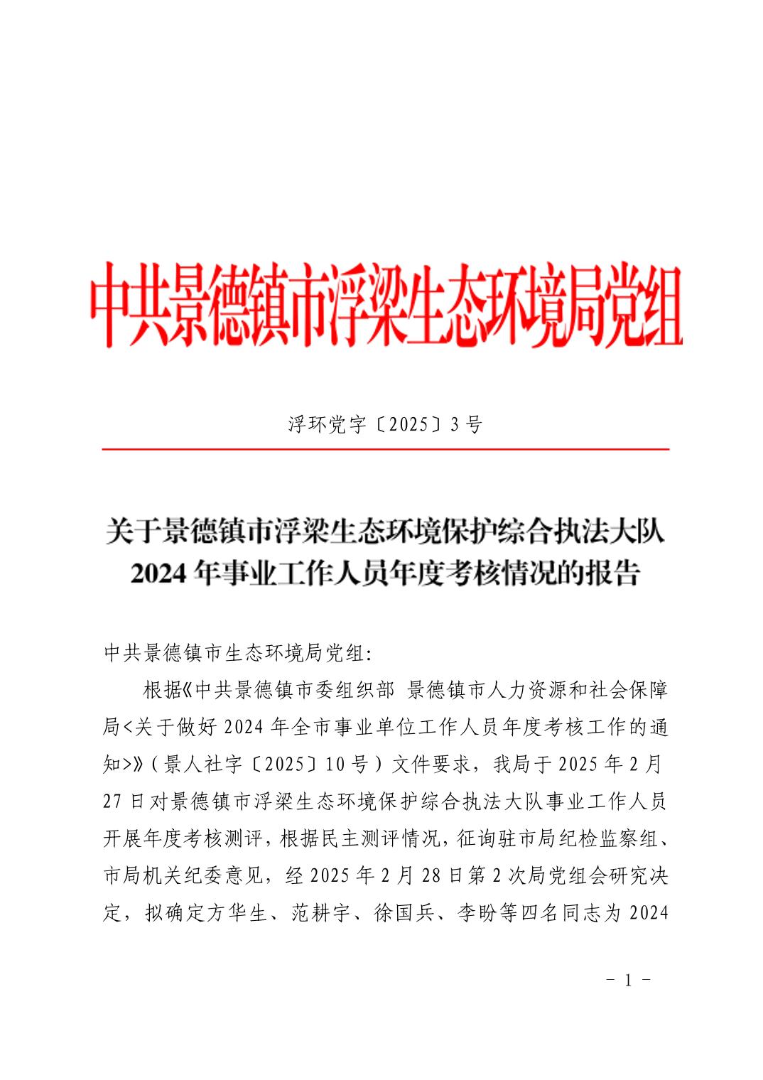 关于景德镇市浮梁生态环境保护综合执法大队2024年事业工作人员年度考核情况的报告