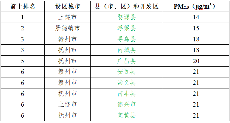 2022年12月,全省共57个县(市、区)和开发区PM2.5月均浓度达到二级标准,排名前十(出现并列一并列入)的依次为婺源县、浮梁县、寻乌县、南城县、广昌县、安远县、崇义县、南丰县、德兴市和宜黄县;排名后十(出现并列一并列入)的依次为安源区、湘东区、彭泽县、峡江县、东湖区、湖口县、浔阳区、南昌高新区、芦溪县、九江经开区、上栗县和西湖区。