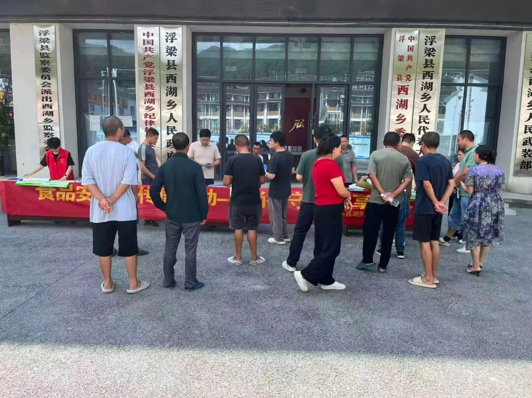 活动前期,西湖乡党委、政府高度重视,多次召开专题会议部署安排,成立由乡食安办牵头,市场监管、农业农村、派出所等多部门参与的工作专班,明确职责分工,确保活动落地见效。结合乡村实际,活动在乡政府设立主会场,通过悬挂“食品安全宣传周活动--‘尚德守法,共享食安’”等宣传横幅、张贴海报,营造浓厚氛围。