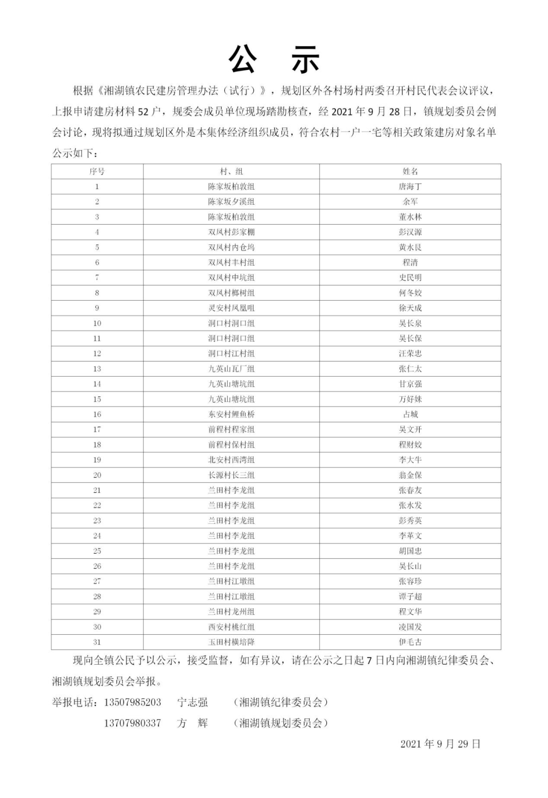 现将拟通过审批名单公示如下,向全镇予以公示,接受群众监督,如有异议,请在公示之日起7日内向湘湖镇纪律委员会、湘湖镇规划委员会举报。