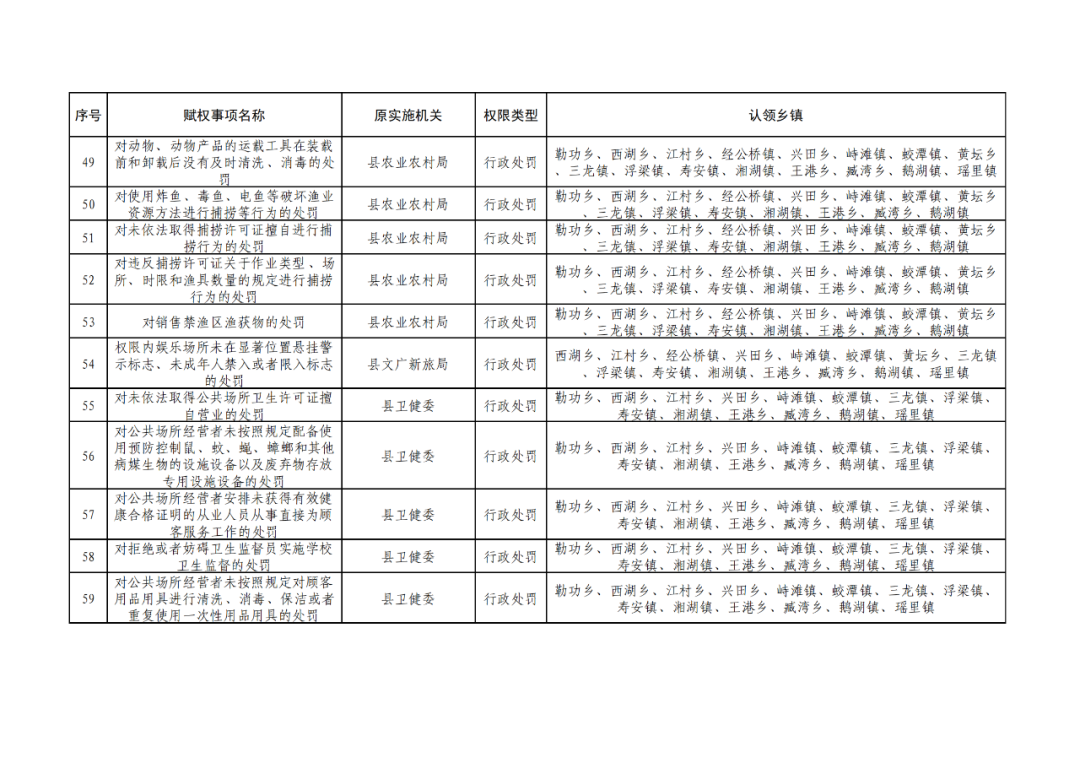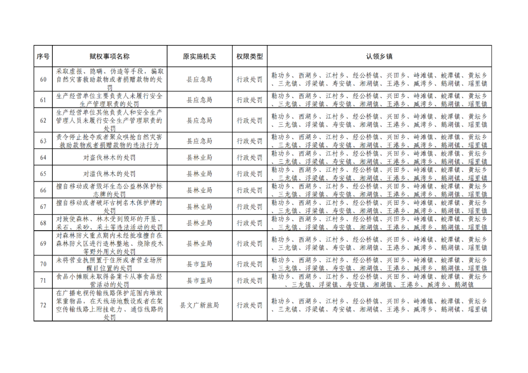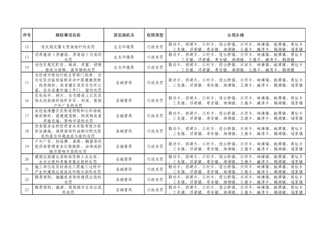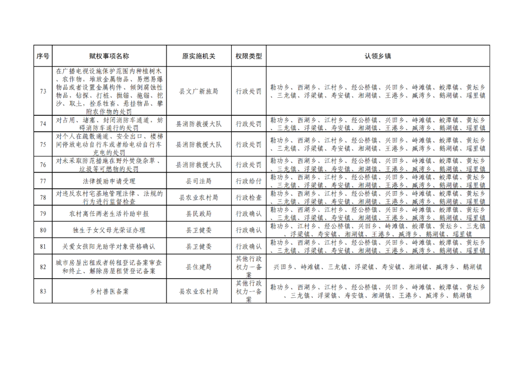 为深化“放管服”改革,认真贯彻落实《江西省人民政府关于调整赋予乡镇(街道)县级审批服务执法权限和经济发达镇县级经济社会管理权限指导目录的通知》(赣府发〔2021〕23 号)和《浮梁县人民政府办公室关于印发浮梁县赋予乡镇(街道)县级审批服务执法权限工作实施方案的通知》(浮府办字〔2022〕18 号)文件精神,根据县政府统一工作部署,现对调整后的赋予乡镇县级审批服务执法权限清单予以公布。请各相关职能部门强化协同配合,指导乡镇开展相关业务培训,帮助处理工作推进中的困难、问题;各乡镇人民政府要依法向社会公布实施,建立健全权力运行、保障和监督机制,强化权力运行监督管理,确保赋权事项高效运行。