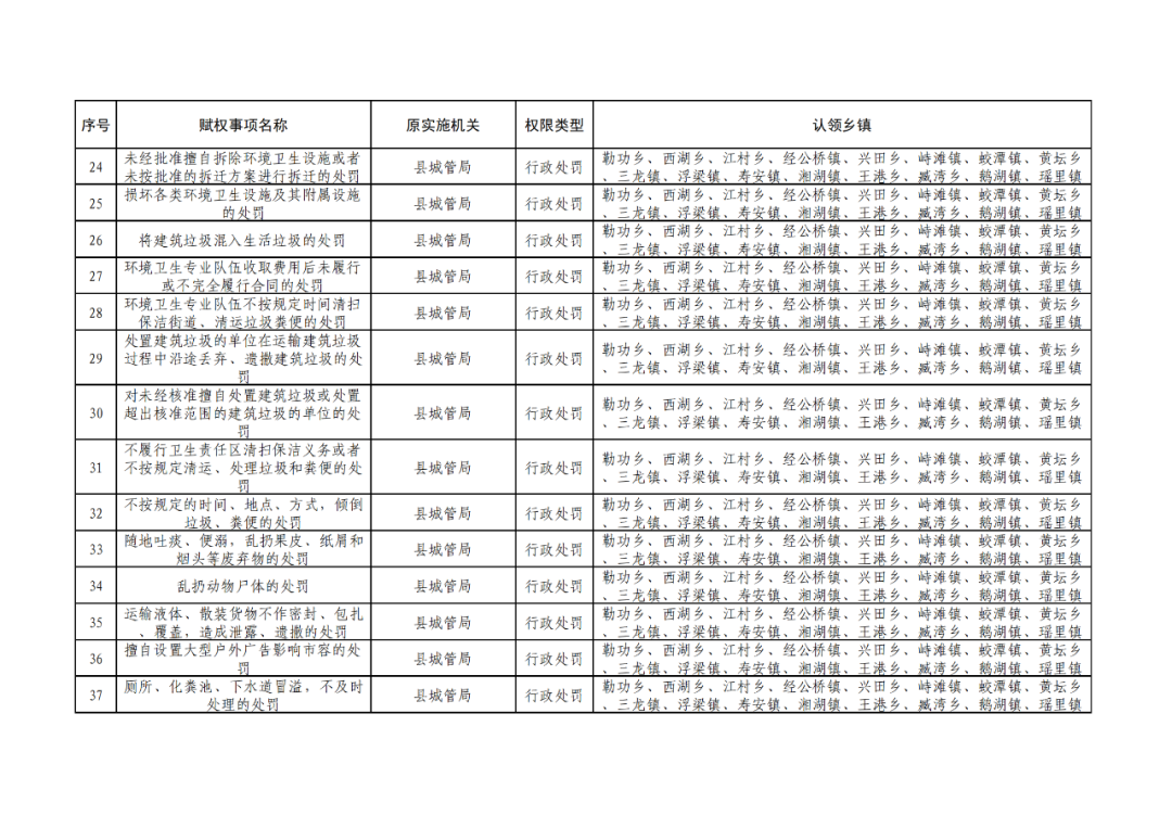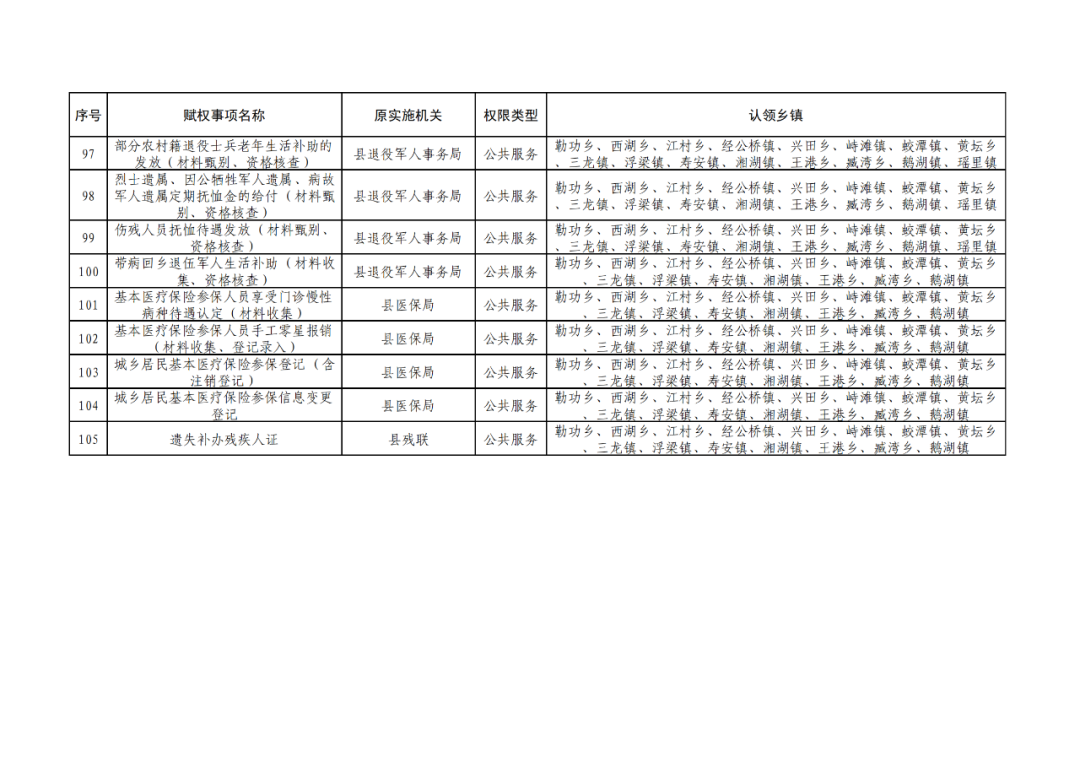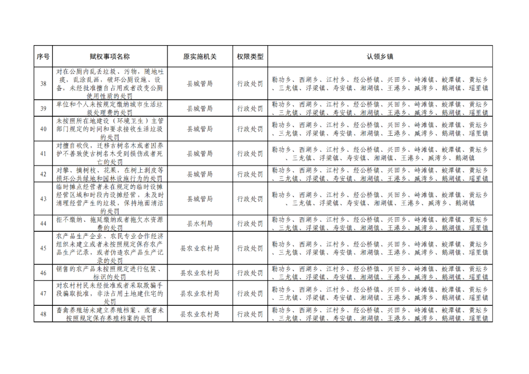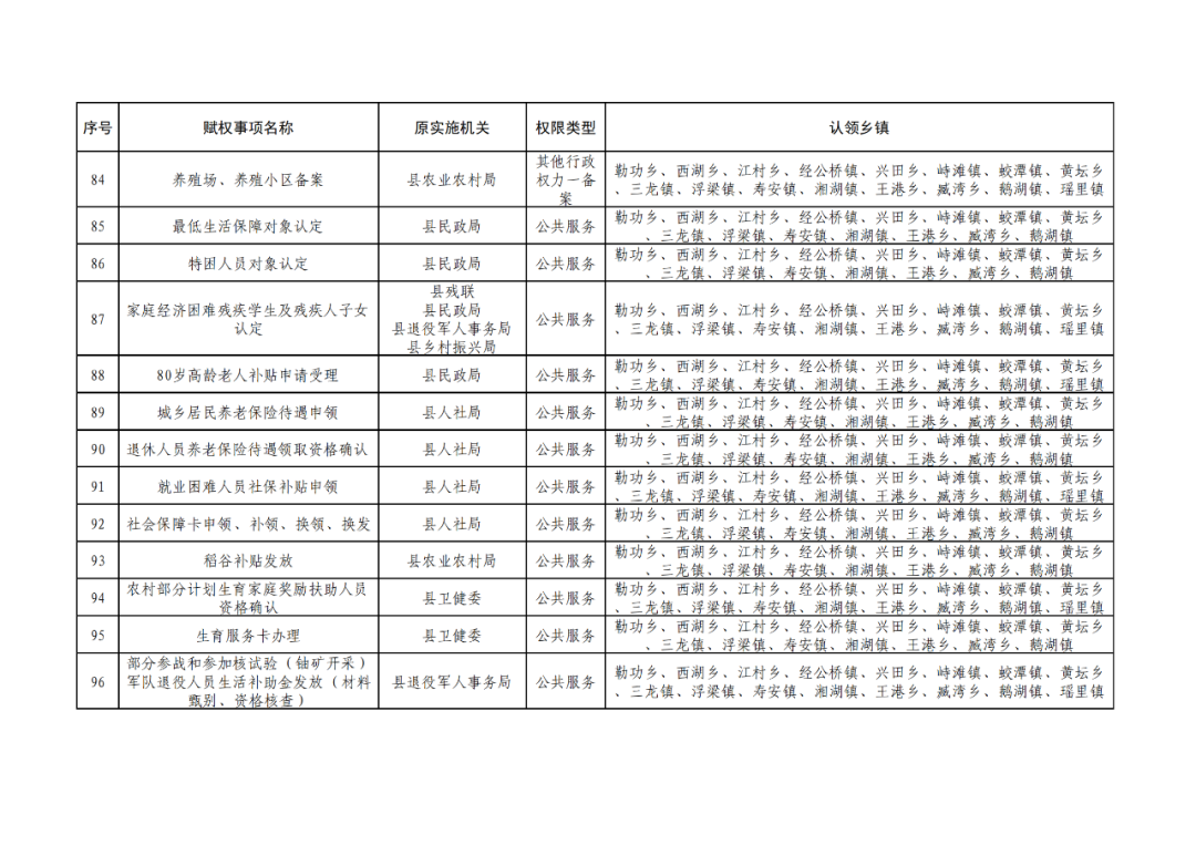为深化“放管服”改革,认真贯彻落实《江西省人民政府关于调整赋予乡镇(街道)县级审批服务执法权限和经济发达镇县级经济社会管理权限指导目录的通知》(赣府发〔2021〕23 号)和《浮梁县人民政府办公室关于印发浮梁县赋予乡镇(街道)县级审批服务执法权限工作实施方案的通知》(浮府办字〔2022〕18 号)文件精神,根据县政府统一工作部署,现对调整后的赋予乡镇县级审批服务执法权限清单予以公布。请各相关职能部门强化协同配合,指导乡镇开展相关业务培训,帮助处理工作推进中的困难、问题;各乡镇人民政府要依法向社会公布实施,建立健全权力运行、保障和监督机制,强化权力运行监督管理,确保赋权事项高效运行。