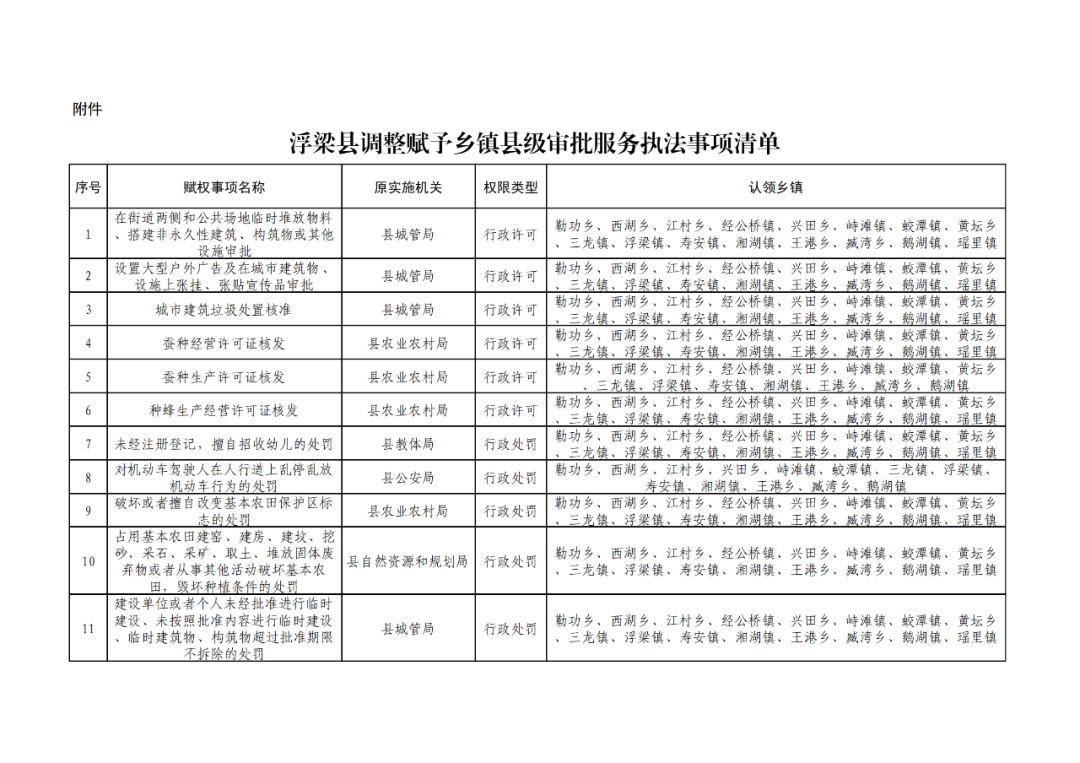 浮梁县人民政府办公室关于公布调整赋予乡镇县级审批服务执法权限清单的通知