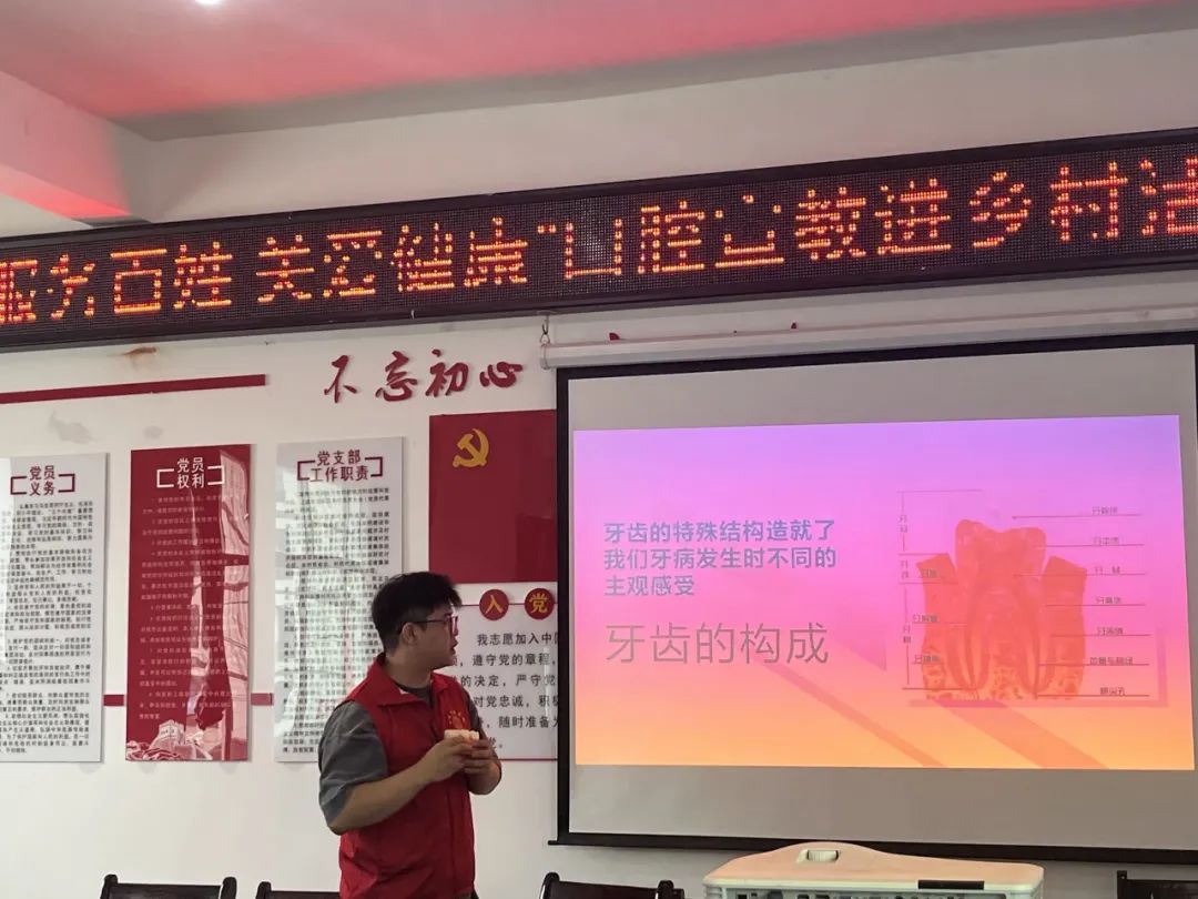 活动现场,瓷城口腔医院医务人员通过ppt演讲的形式,生动形象地科普了常见口腔健康问题如儿童龋齿、牙齿松动、牙周病、牙髓炎的成因、演变、预防及治疗方式,并纠正了部分群众对口腔疾病的误解。同时利用牙齿结构图和牙齿模型为大家演示了正确的刷牙方法,指导大家在日常生活中养成爱牙护齿的生活习惯,定期进行口腔检查,及时消除口腔疾病隐患。