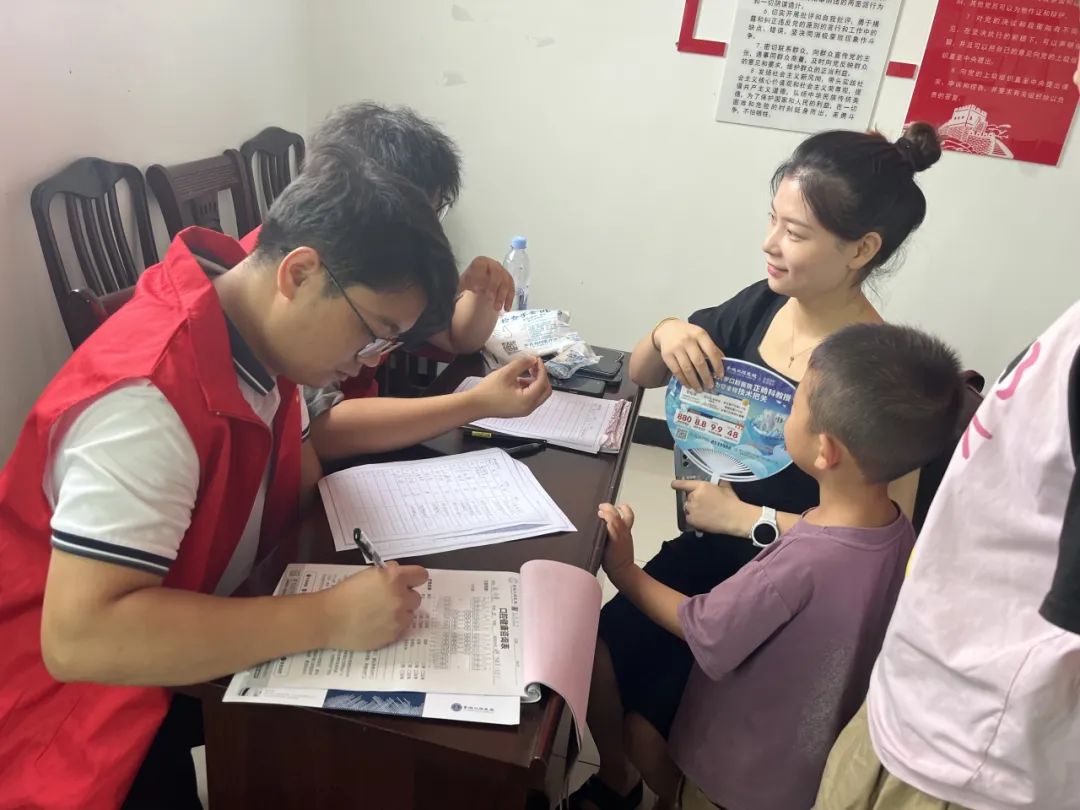 随后,志愿者引导现场群众排队登记,有条不紊地组织大家参与口腔检查。医务人员耐心细致地为前来咨询的村民免费检查牙齿松动、缺失、牙龈肿痛出血等问题,仔细记录村民的口腔健康状况,并根据他们现有的口腔问题给出针对性意见及治疗建议。