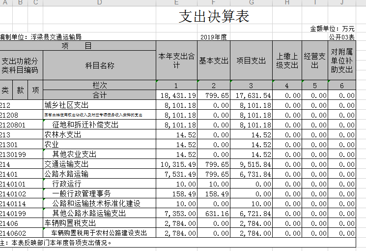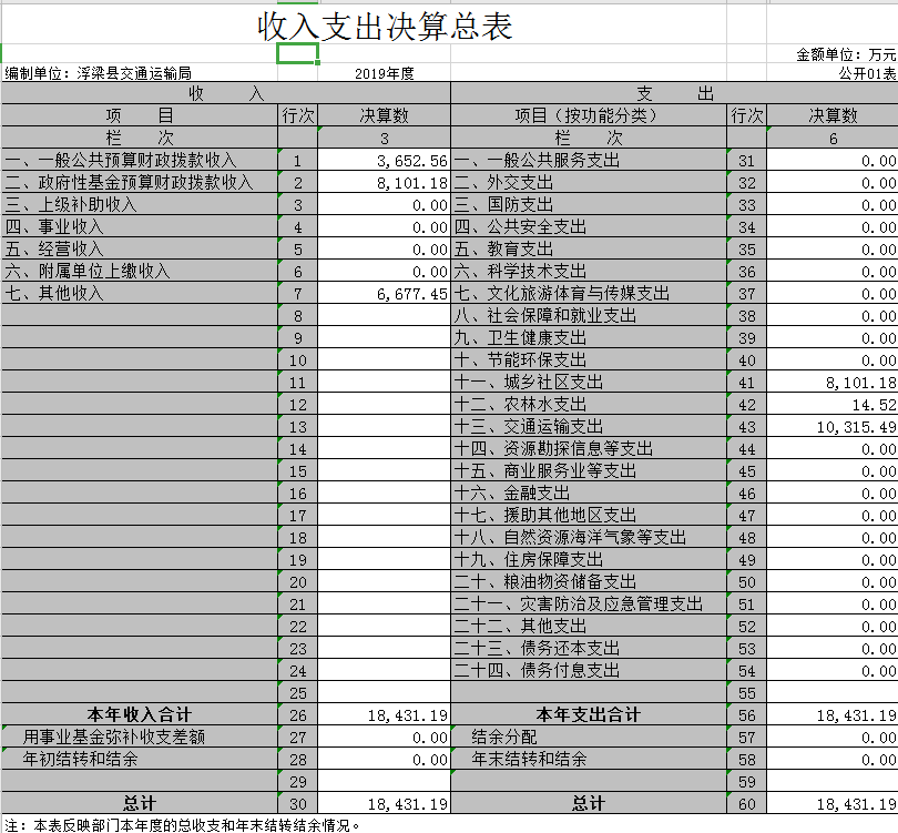 本部门2019年度支出总计18431.19万元,其中年初结转和结余0万元,较2018年增加(减少)0万元,增长(下降)0%;本年收入合计18431.19万元,较2018年增加16622.93万元,增长919.28%。主要原因是:2019年度政府会计制度开始实施,涉及到交通建设的资金都拨付给了我局本级,再由我局本级拨付给各项目管理部门及全县相关乡、镇,因此本年度涉及的相关资金支出较多。