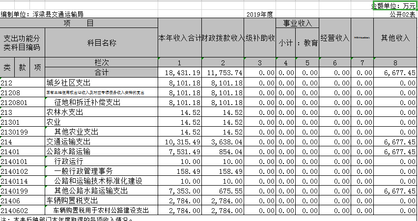 本部门2019年度收入总计18431.19万元,其中年初结转和结余0万元,较2018年增加(减少)0万元,增长(减少)0%;本年收入合计18431.19万元,较2018年增加16622.93万元,增长919.28%,主要原因是:新政府会计制度实施,所有涉及到交通建设的资金都拨付给我局本级部门,由交通局本级拨付给相关交通建设管理部门及各乡镇部门。