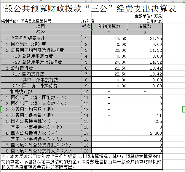 (二)公务接待费支出年初预算数为22.5万元,决算数为10.42万元,完成预算的46.3%,决算数较2018年增加4.78万元,增长84.75%。主要原因是:涉及交通建设的项目较多,相关部门也多,因此本年度的公务接待与上年度的公务接待相比有所增加。