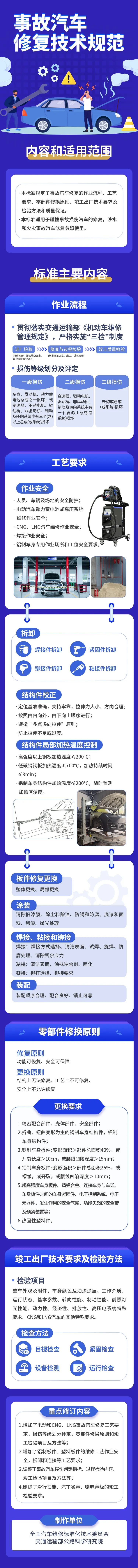 2023年11月24日,交通运输部修订发布了交通运输行业标准《事故汽车修复技术规范》(JT/T 795—2023),将于2024年3月1日正式实施。该标准重点针对汽车电动化、轻量化等新技术进行修订,完善了事故汽车修复作业流程、工艺要求、零部件修换原则、竣工出厂技术要求及检验方法等内容,为规范事故汽车维修和保险定损提供了重要的技术依据,切实保障汽车维修质量和安全,保护车主权益。