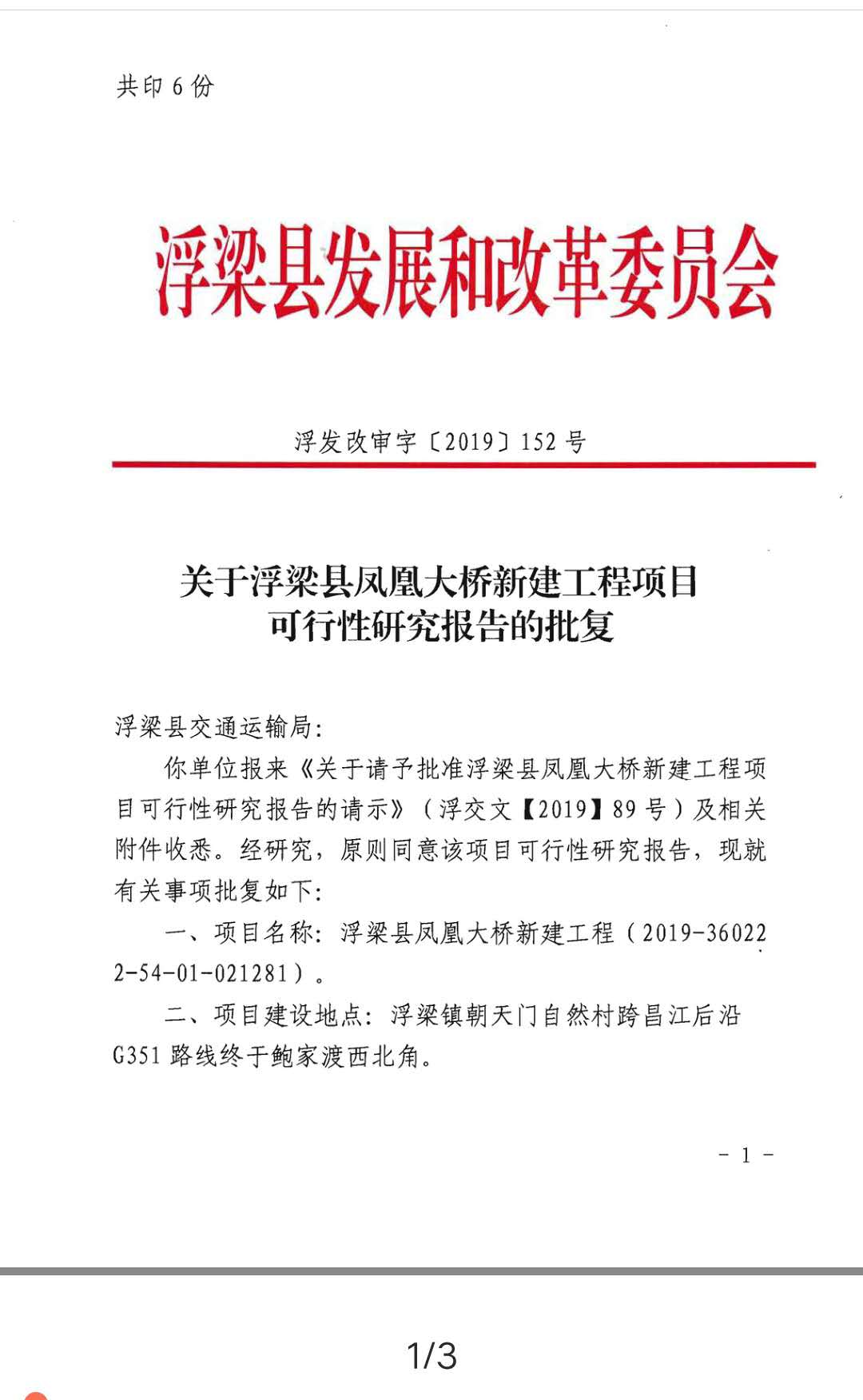 关于浮梁县凤凰桥新建工程项目可行性研究报告的批复