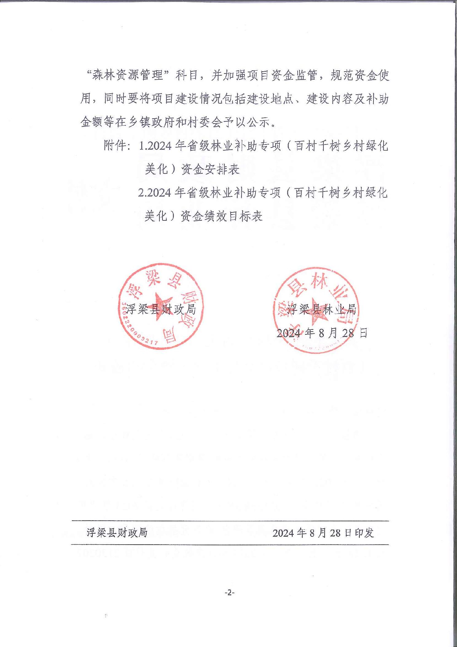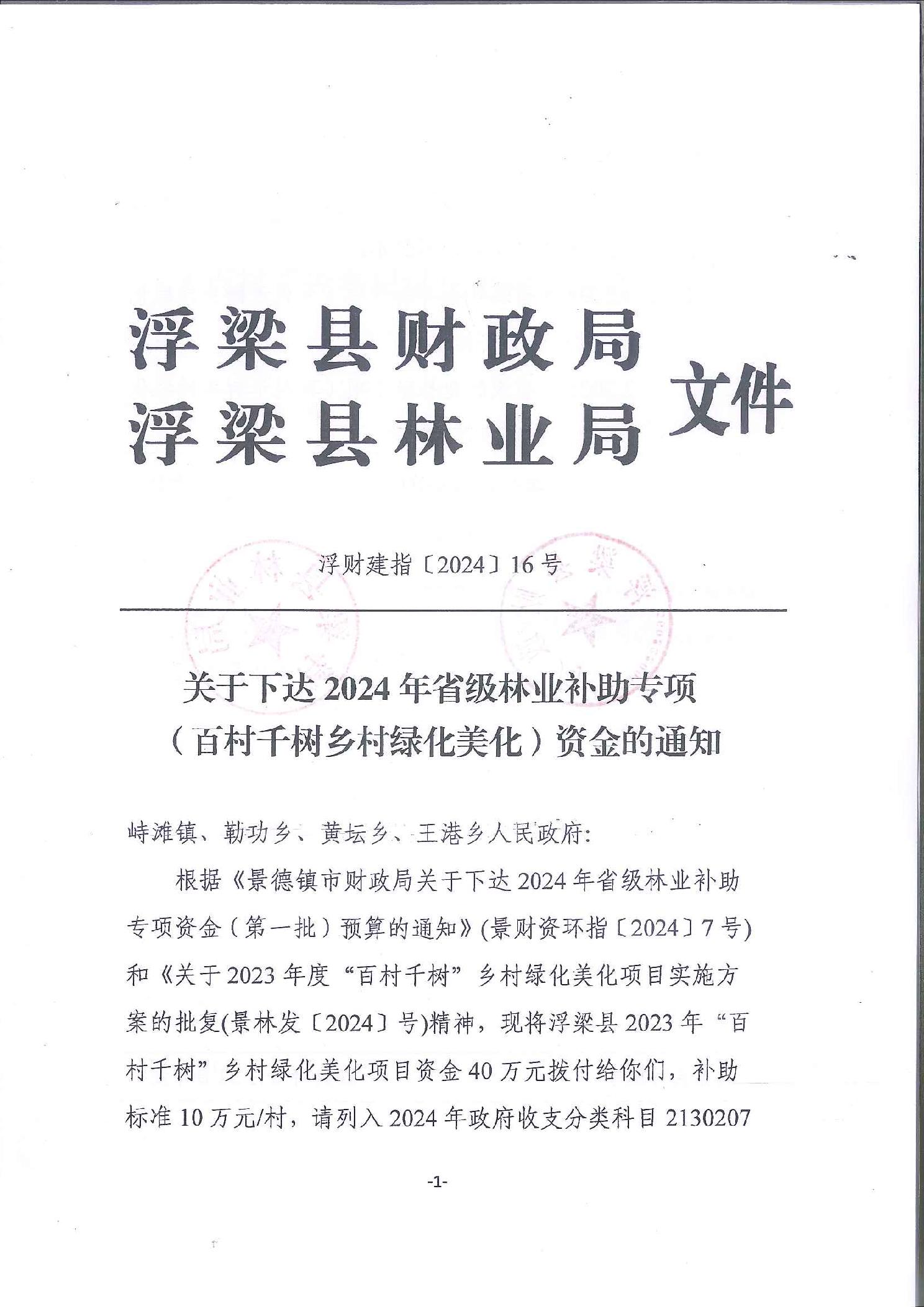 关于下达2024年省级林业补助专项(百村千树乡村绿化美化)资金的通知(浮财建指〔2024〕16号)