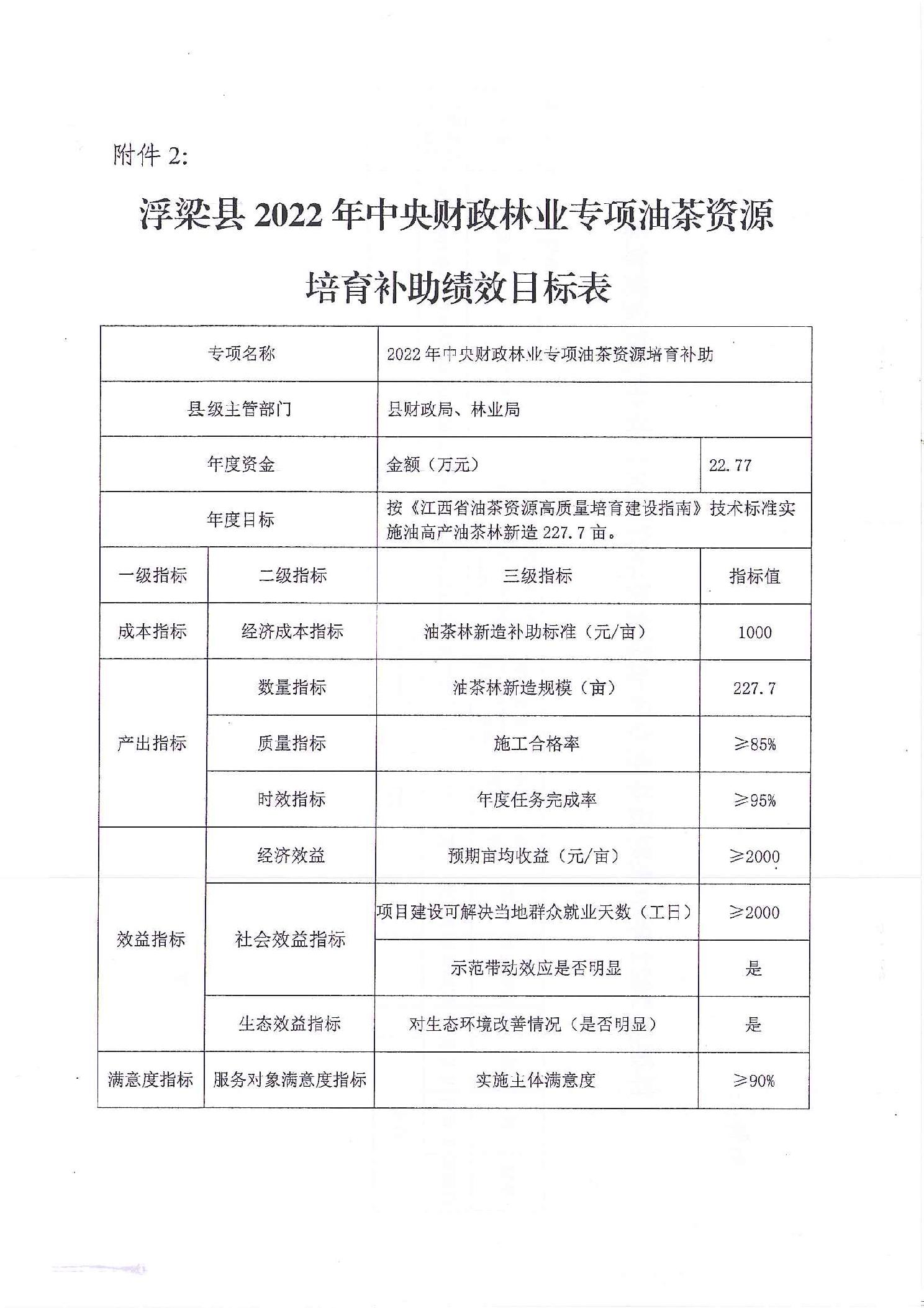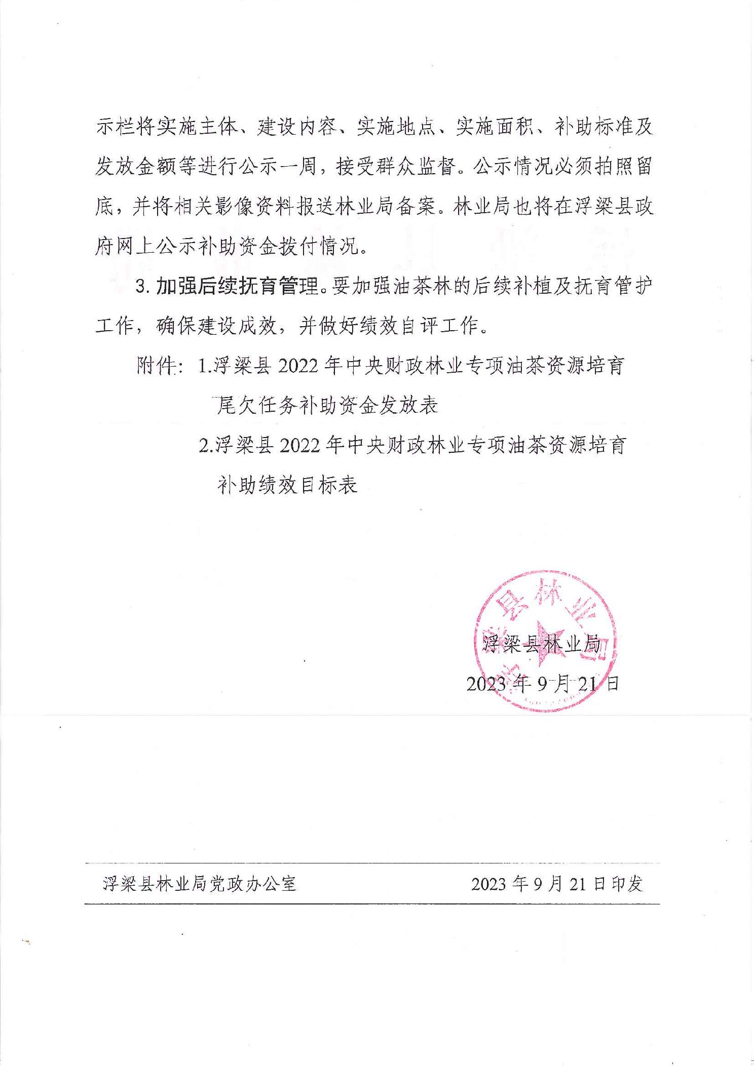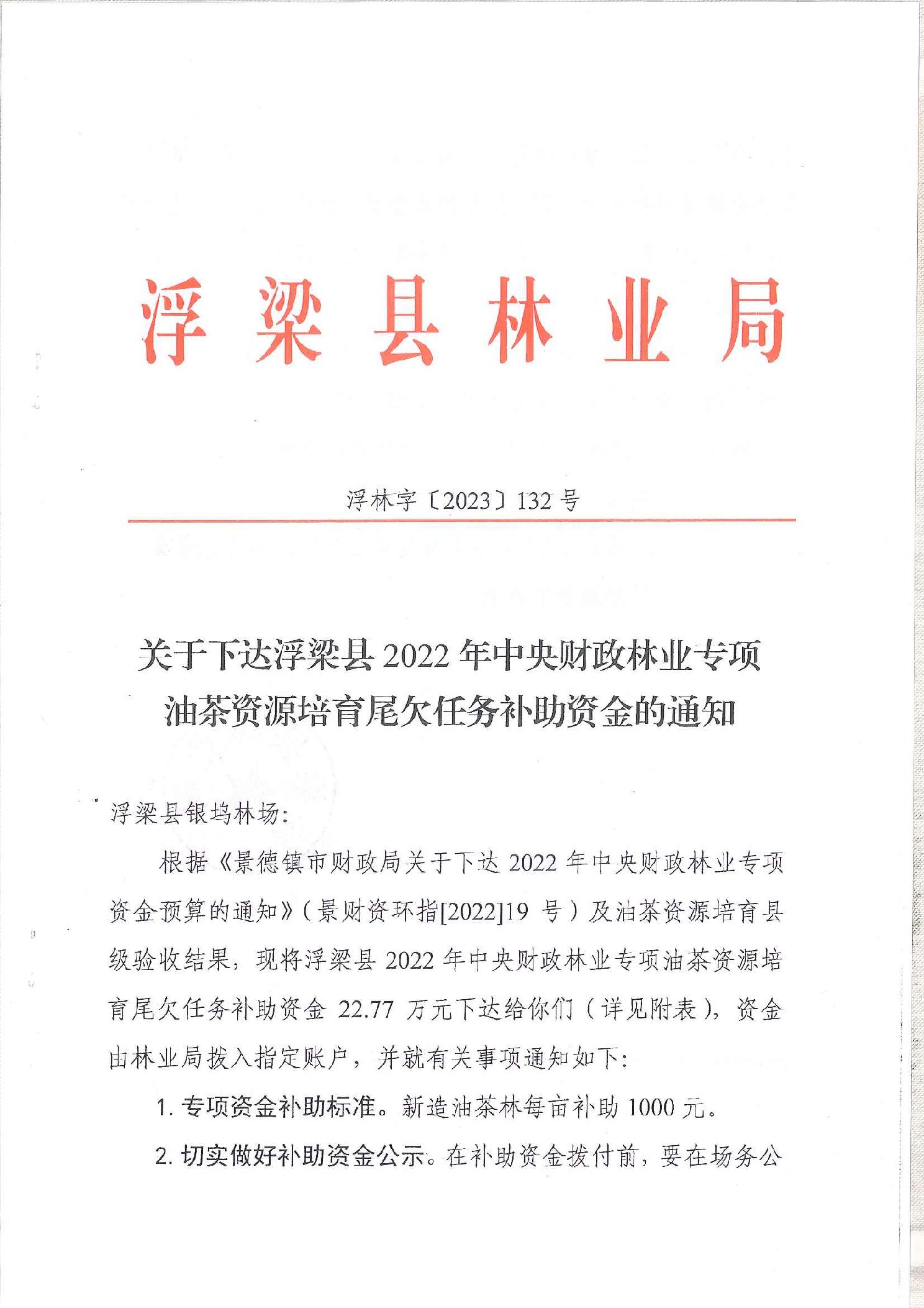 关于下达浮梁县2022年中央财政林业专项油茶资源培育尾欠任务补助资金的通知(浮林字〔2023〕132号)