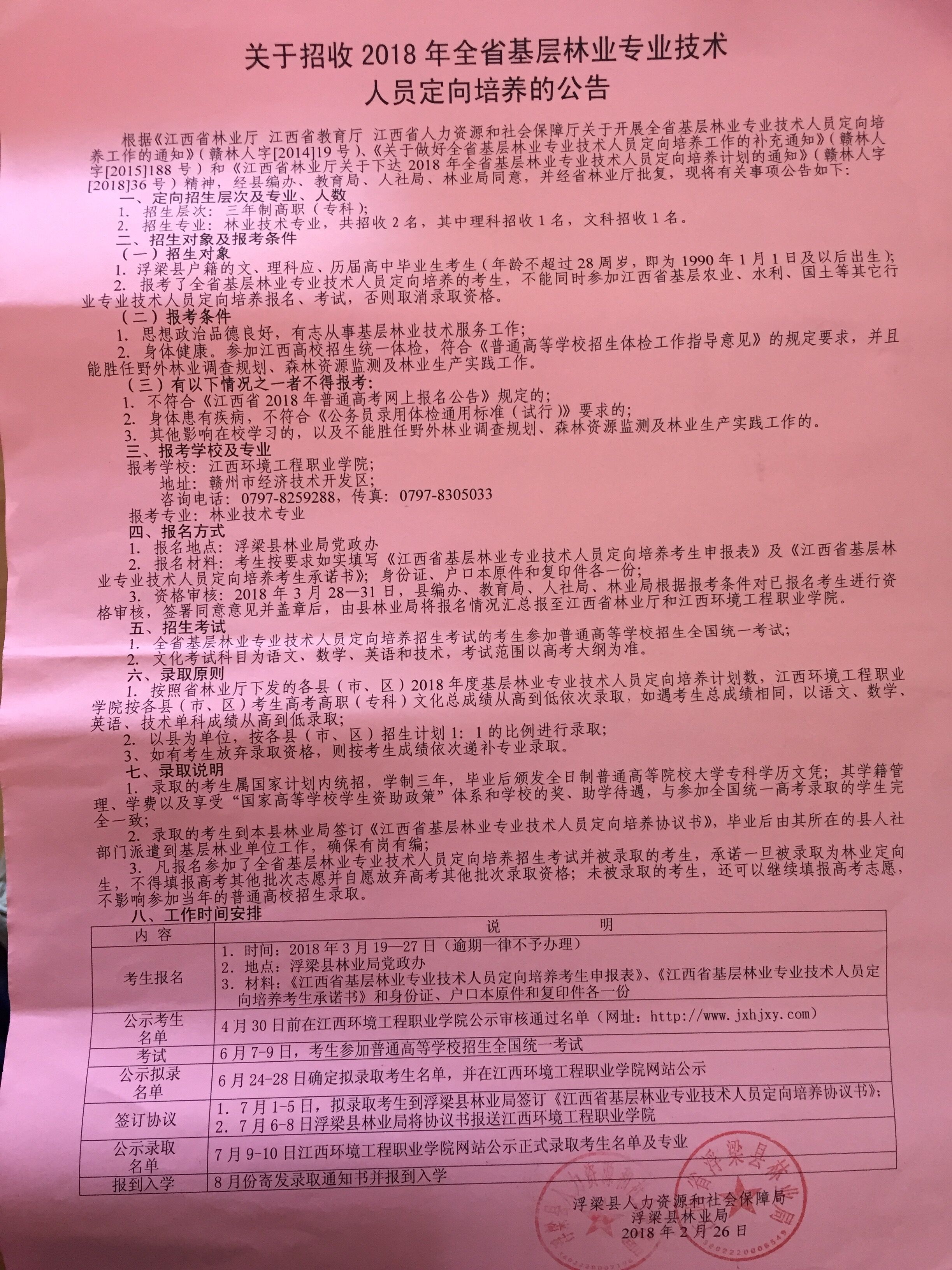 根据《江西省林业厅 江西省教育厅 江西省人力资源和社会保障厅关于开展全省基层林业专业技术人员定向培养工作的通知》(赣林人字[2014]19号)、《关于做好全省基层林业专业技术人员定向培养工作的补充通知》(赣林人字[2015]188号)和《江西省林业厅关于下达2018年全省基层林业专业技术人员定向培养计划的通知》(赣林人字[2018]36号)精神,经县编办、教育局、人社局、林业局同意,并经省林业厅批复,现将有关事项公告如下: