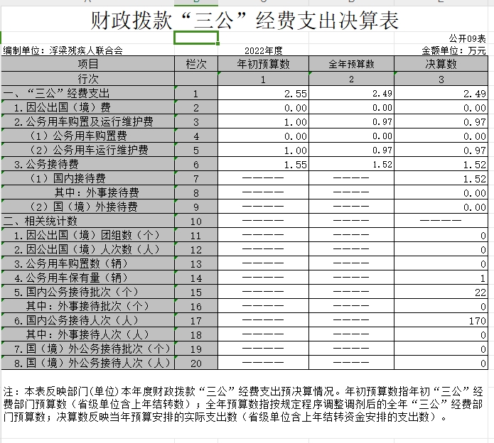 (三)公务用车购置及运行维护费支出 0.97万元,其中公务用车购置年初预算数为 0万元,决算数为 0.97万元,完成预算的 100%,决算数较2021年减少0.76万元,降低43.93 %,主要原因是下乡了解残疾人情况次数减少,全年购置公务用车 0 辆。决算数较年初预算数增加(减少)的主要原因是:……;公务用车运行维护费支出年初预算数为 0.97万元,决算数为0.97万元,完成预算的 100%,决算数较2021年减少0.76万元,降低43.93 %,主要原因是下乡了解残疾人情况次数减少,年末公务用车保有1 辆。决算数较年初预算数增加(减少)的主要原因是:无增加。