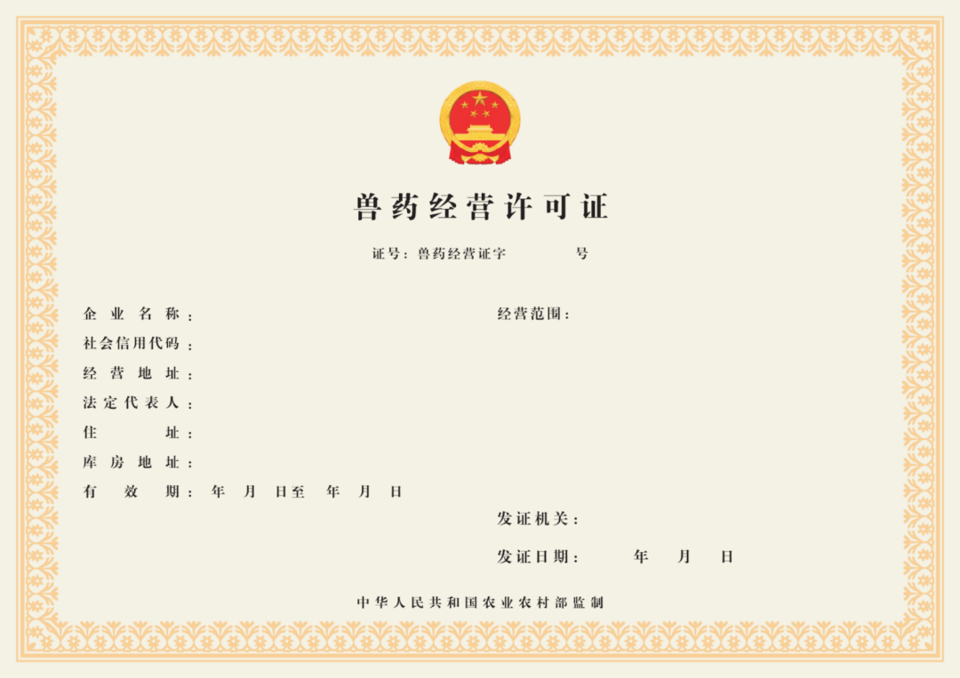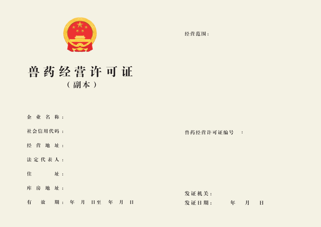新版《兽药经营许可证》的经营范围表述应为:兽用中药、化学药品;兽用生物制品(应载明国家强制免疫用生物制品或非国家强制免疫用生物制品);兽用特殊药品(兽用麻醉药品、兽用精神药品、兽用易制毒化学药品、兽用毒性药品、兽用放射性药品等);兽用原料药。