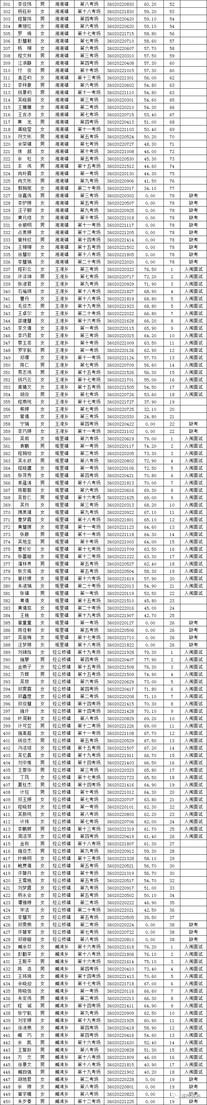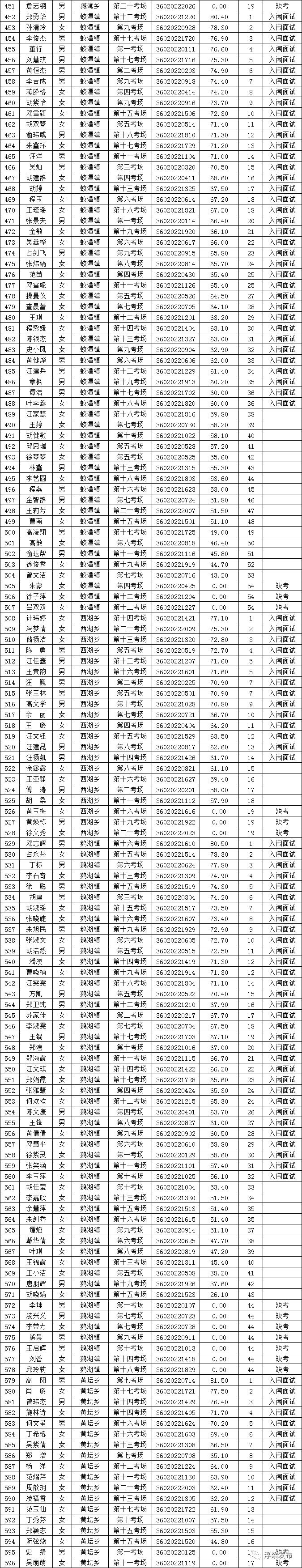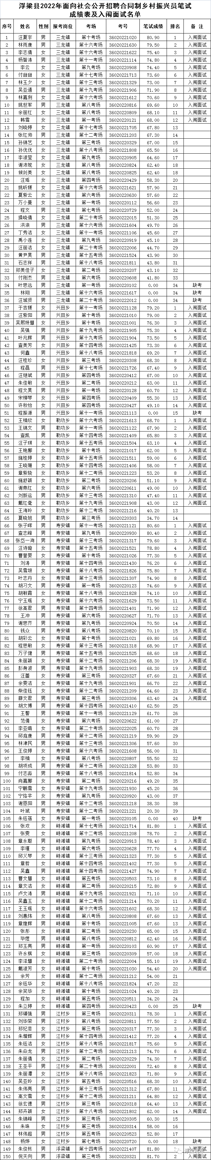 浮梁县2022年面向社会公开招聘合同制乡村振兴员笔试成绩表及入闱面试名单