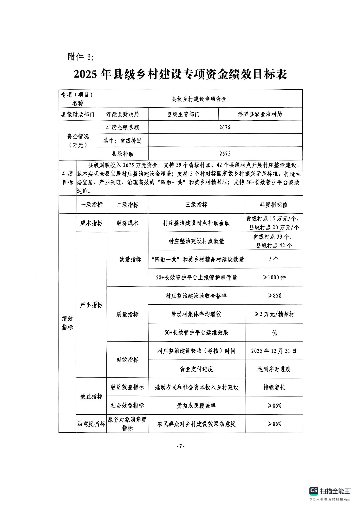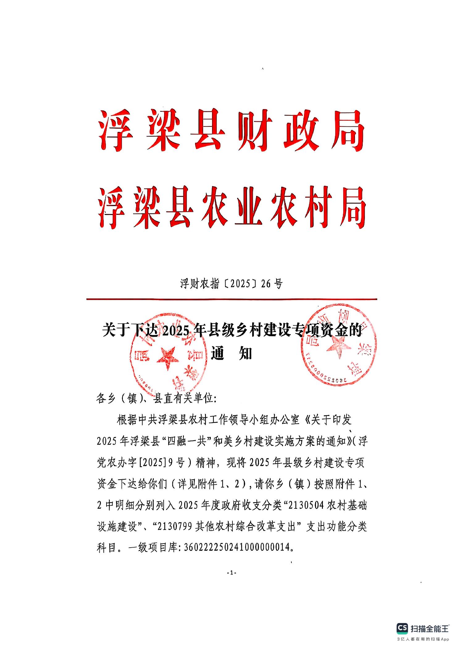 浮财农指【2025】26号《关于下达2025年县级乡村建设专项资金的通知》