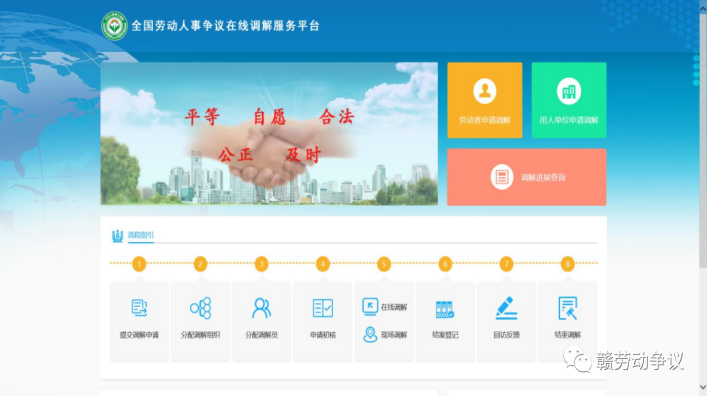 江西省结合本省实际,创新提出建设“智慧仲裁”信息系统,即劳动人事争议智慧仲裁办案系统、劳动人事争议调解管理信息系统和“赣裁通”微信小程序公共服务平台、“赣e裁”微信小程序仲裁员移动办案平台、数据共享交互平台。现为了更好地增强“互联网+调解”服务平台的普及度,扩大平台的知晓率和使用率,使广大人民群众更多地了解平台,更方便地使用平台进行调解申请,为切实向劳动人事争议案件双方提供方便快捷的移动服务,现将“互联网+调解”服务平台及“赣裁通”公共服务平台操作流程公布如下: