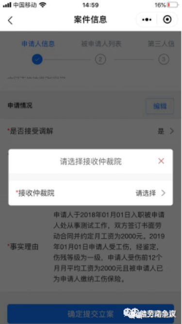 第六步:确定提交立案后会弹出选择仲裁院界面,用户需将案件提交到自己地区所在仲裁机构,如下图: