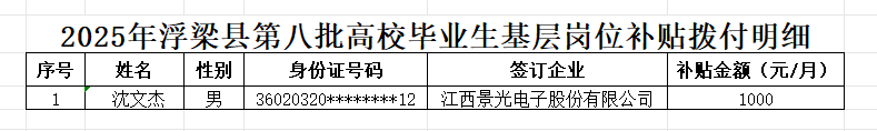 根据《江西省人力资源和社会保障厅江西省工业和信息化厅 江西省财政厅关于做好高校毕业生基层就业岗位补贴工作的通知》(赣人社字[2025]108号)文件要求,经审核,截至目前1人符合2025年度高校毕业生基层岗位补贴条件,现将人员名单予以公示,接受社会监督,公示期间如有异议,请向浮梁县就业创业服务中心反映。