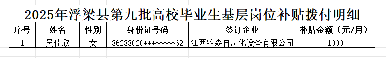 根据《江西省人力资源和社会保障厅江西省工业和信息化厅 江西省财政厅关于做好高校毕业生基层就业岗位补贴工作的通知》(赣人社字[2025]108号)文件要求,经审核,截至目前1人符合2025年度高校毕业生基层岗位补贴条件,现将人员名单予以公示,接受社会监督,公示期间如有异议,请向浮梁县就业创业服务中心反映。