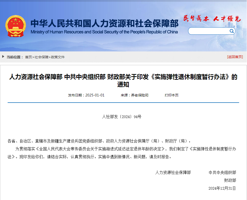 人力资源社会保障部 中共中央组织部 财政部关于印发《实施弹性退休制度暂行办法》的通知各省、自治区、直辖市及新疆生产建设兵团党委组织部、政府人力资源社会保障厅(局)、财政厅(局):为贯彻落实《全国人民代表大会常务委员会关于实施渐进式延迟法定退休年龄的决定》,我们制定了《实施弹性退休制度暂行办法》。现印发给你们,请结合实际,认真贯彻执行。实施中遇到新情况、新问题,请及时报告。为贯彻落实《全国人民代表大会常务委员会关于实施渐进式延迟法定退休年龄的决定》,体现自愿、弹性原则,切实保障职工合法权益,促进人力资源开发利用,制定本办法。第一条 职工达到国家规定的按月领取基本养老金最低缴费年限,可以自愿选择弹性提前退休,提前时间距法定退休年龄最长不超过3年,且退休年龄不得低于女职工50周岁、55周岁及男职工60周岁的原法定退休年龄。第二条 职工自愿选择弹性提前退休的,至少在本人选择的退休时间前3个月,以书面形式告知所在单位。第三条 职工按法定退休年龄退休的,所在单位应及时为其办理退休手续。第四条 职工达到法定退休年龄,所在单位与职工协商一致的,可以弹性延迟退休,延迟时间距法定退休年龄最长不超过3年。所在单位与职工应提前1个月,以书面形式明确延迟退休时间等事项。弹性延迟退休时间确定后,不再延长。公务员、国有企事业单位领导人员及其他管理人员,达到法定退休年龄时应当及时办理退休手续。第五条 弹性延迟退休期间,所在单位与职工的劳动关系或人事关系延续,单位和职工应按时足额缴纳社会保险费,按照劳动合同法、事业单位人事管理条例等法律法规保障职工合法权益。第六条 职工达到弹性延迟退休时间,劳动关系或人事关系终止,所在单位应按规定为其办理退休手续。弹性延迟退休期间,所在单位与职工协商一致,可以终止弹性延迟退休,按规定办理退休手续。第七条 弹性提前退休的职工,应达到所选择退休时间对应年份最低缴费年限;弹性延迟退休的职工,应达到本人法定退休年龄对应年份最低缴费年限。第八条 所在单位应不晚于职工选择的退休时间当月,按规定向社会保险经办机构提出领取基本养老金申请,如实提供退休时间申请书等材料。第九条 社会保险经办机构应及时对领取基本养老金申请进行审核。职工从审核通过的退休时间次月开始领取基本养老金。第十条 对已经领取基本养老金的人员,不再受理弹性退休申请。第十一条 各地区、各单位要严格执行国家规定,充分尊重职工意愿,保障其依法选择退休年龄的权利。用人单位不得违背职工意愿,违法强制或变相强制职工选择退休年龄。第十二条 各级社会保险经办机构要探索扩展退休服务,主动为临近退休年龄的参保人员提供关于办理退休手续的预先指导和提前受理等服务。第十三条 机关和国有企事业单位工作人员弹性退休的,应当按照干部人事管理权限和规定程序报批同意。第十四条 本办法自2025年1月1日起施行。2024年12月31日前已经达到原法定退休年龄的人员,不适用本办法。人力资源社会保障部、中央组织部、财政部1月1日发布《实施弹性退休制度暂行办法》。三部门相关司局负责同志就办法有关问题回答了记者提问。答:党的二十届三中全会提出,按照自愿、弹性原则,稳妥有序推进渐进式延迟法定退休年龄改革。《全国人民代表大会常务委员会关于实施渐进式延迟法定退休年龄的决定》明确,职工可自愿选择弹性提前退休或弹性延迟退休。实施弹性退休,是我国渐进式延迟法定退休年龄改革的一项重要内容,有利于适应劳动者多样化需求,满足不同的工作生活安排需要。改革实施后,职工的退休年龄由原来的一个刚性节点,拓展成为一个弹性区间,增加了职工对退休年龄的选择权。为落实好自愿、弹性原则,切实保障职工合法权益,促进人力资源开发利用,执行好决定提出的弹性退休政策,三部门制定了《实施弹性退休制度暂行办法》,明确了弹性退休办理程序、权益保障等内容,对优化社保经办服务提出了要求。答:办法规定,职工达到国家规定的最低缴费年限,可以自愿选择弹性提前退休,提前时间最长不超过3年,且退休年龄不得低于女职工50周岁、55周岁及男职工60周岁的原法定退休年龄。职工达到法定退休年龄,所在单位与职工协商一致的,可以弹性延迟退休,延迟时间最长不超过3年。比如,某男职工,1972年9月出生,决定实施后法定退休年龄为62周岁,若满足最低缴费年限,那么可以在60周岁至62周岁之间选择弹性提前退休。若该职工没有选择弹性提前退休,达到法定退休年龄62周岁时,可以退休;如果所在单位与其协商一致,还可以在62周岁至65周岁之间弹性延迟退休。答:办法规定,职工自愿选择弹性提前退休的,至少在本人选择的退休时间前3个月,以书面形式告知所在单位。这一规定主要基于两点考虑:一方面,明确告知形式为“书面”,以确保弹性提前退休为职工本人真实意愿;另一方面,明确提前告知的时间,便于用人单位在人员安排上有所准备。答:办法提出,所在单位与职工应提前1个月,以书面形式明确延迟退休时间等事项。弹性延迟退休时间确定后,不再延长。弹性延迟退休期间,所在单位与职工的劳动关系或人事关系延续。这些规定体现了双方协商一致,保障了弹性延迟退休期间的