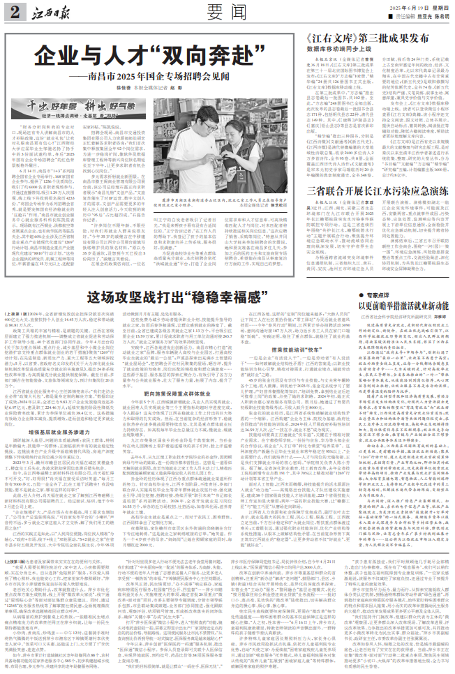 就业,是最基本的民生;稳就业,在江西正化作一场系统推进、全员参与的攻坚战。从省委、省政府将高质量充分就业纳入经济社会发展优先目标的顶层设计,到“5+2就业之家”在基层的星罗棋布;从38亿元“真金白银”为企业减负稳岗的及时雨,到36.59万人次技能培训点燃的希望灯;从400亿元创业贷款激荡的创新活力,到705万个岗位信息在指尖的汇聚流动……一组组沉甸甸的数据背后,是千万个家庭满满的获得感、幸福感、安全感。